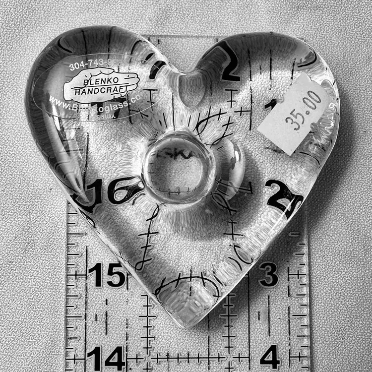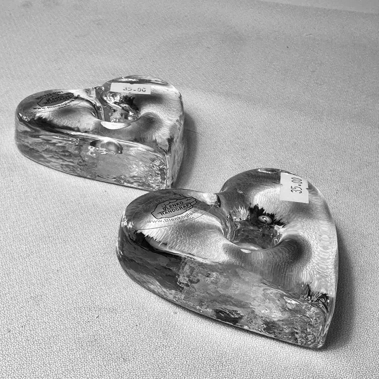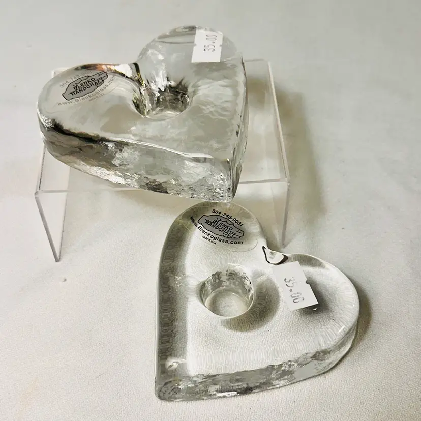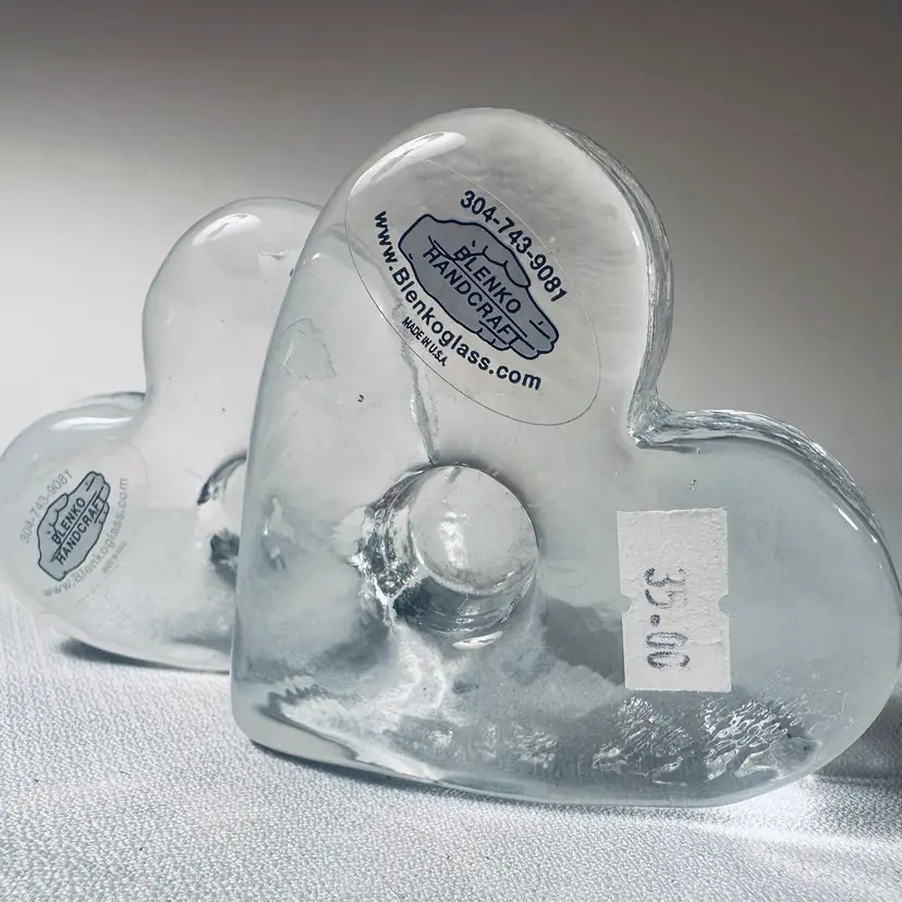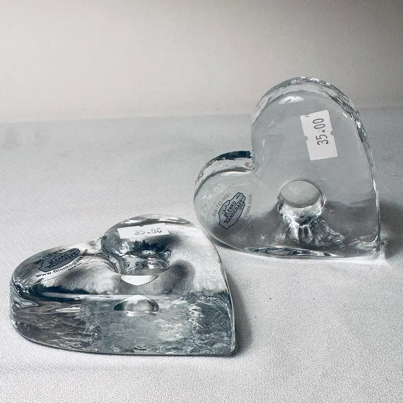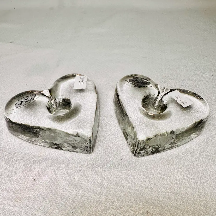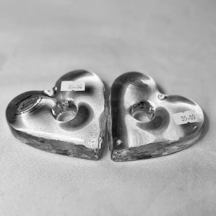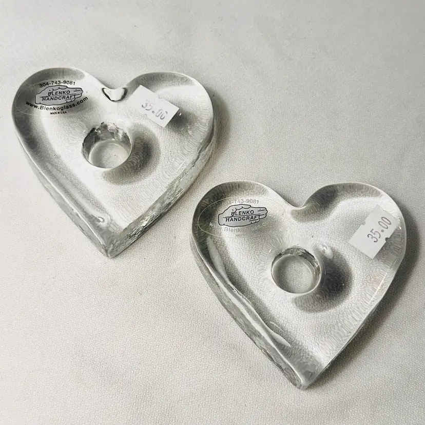 This listing is for a set of two Blenko Glass Heart Candle Holders. Each piece is made of thick, solid clear glass and is designed to hold a taper or dinner candle. They can also be used as Paperweights.