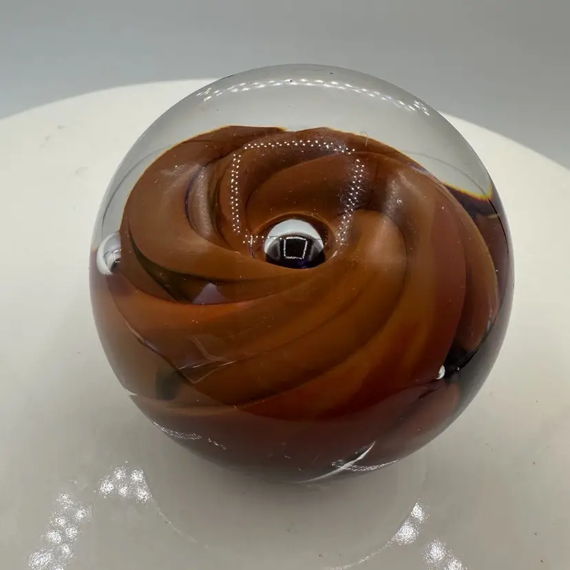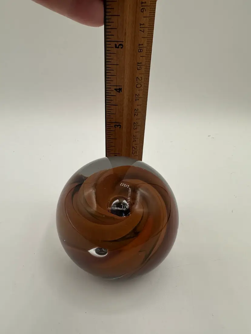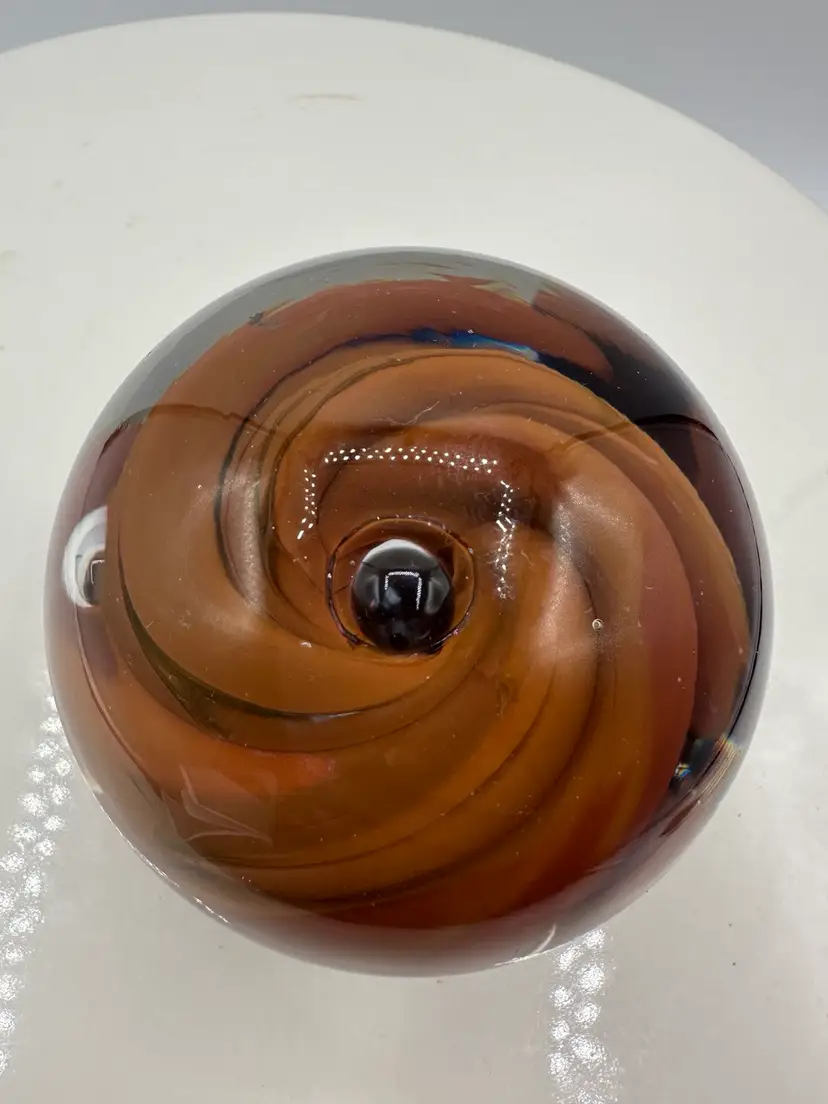Blenko paperweight is large and a real statement piece . Vintage with brown flower like swirl and a center bubble . Has original sticker and in great condition with no chips or cracks