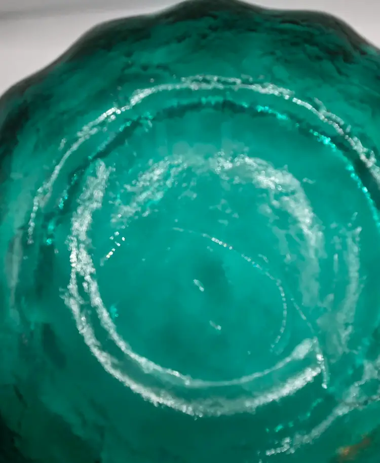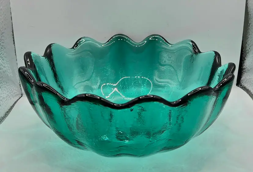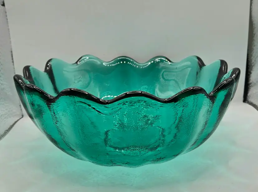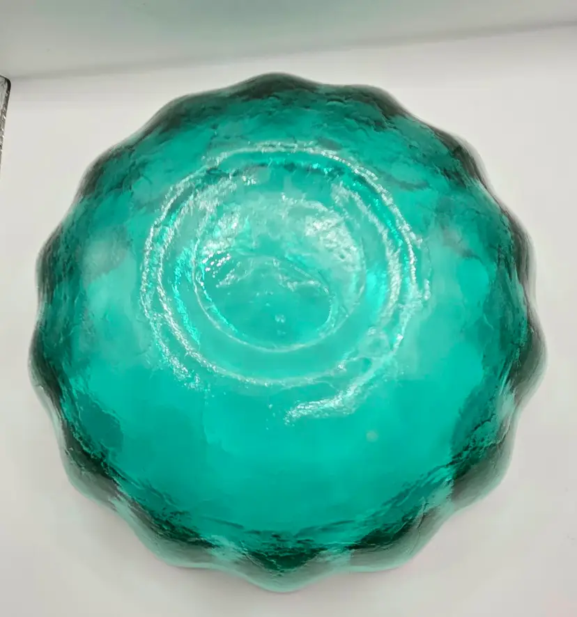 Blenko Sea Green made in 1962 ONLY 6143M. Vintage 1960’s Sea Green/Blue Lotus Bowl. 8.5" x 3.25". Beautiful colour. No chips or cracks. Has normal straw marks (lines from blowing glass into molds) Please see photos as they are part of the description. Item will be well wrapped before shipping.
