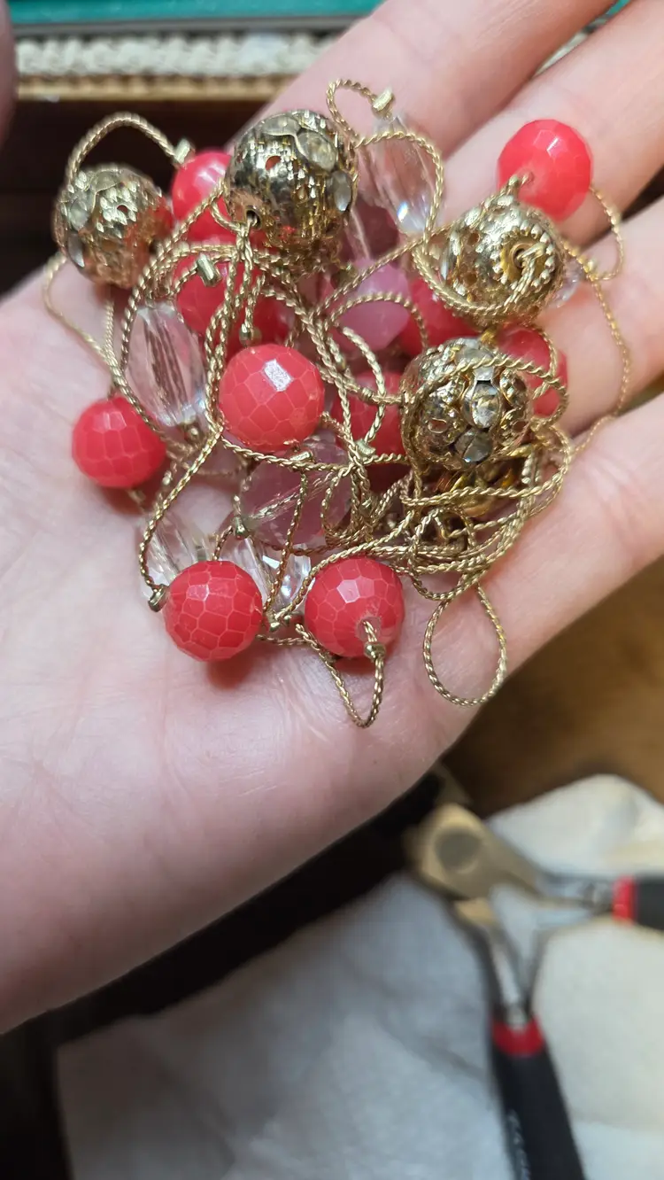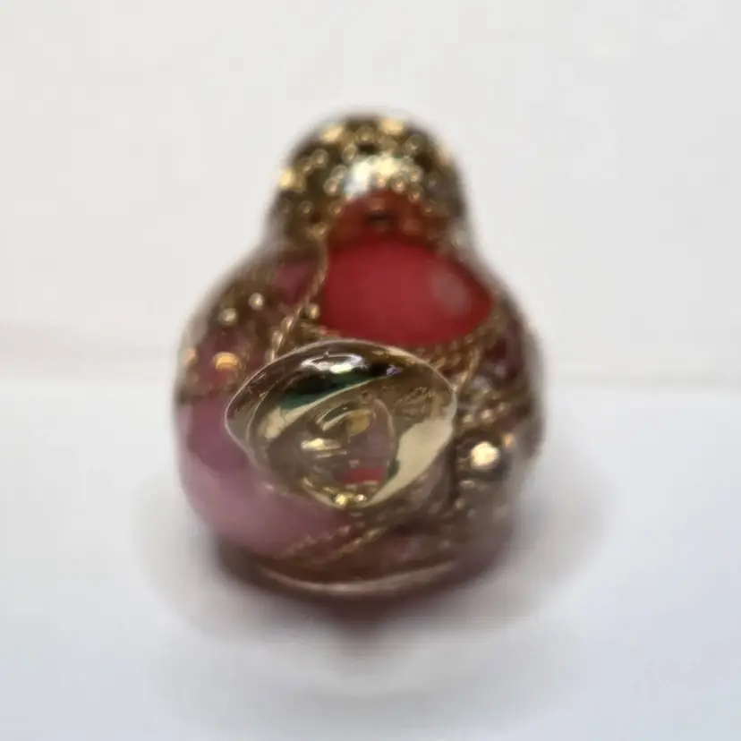 This gal is called Gildie because her head looks like gilded gold. She is made with a gokden seed bead beak, a filigreed type bead from a necklace that came in a craft lot from Orange Hound Studios (OHS). Her tail is made from a pendant also from OHS. Her body is from the same necklace as the head.