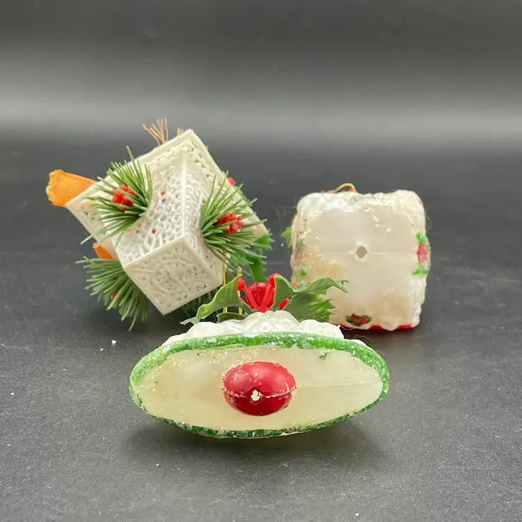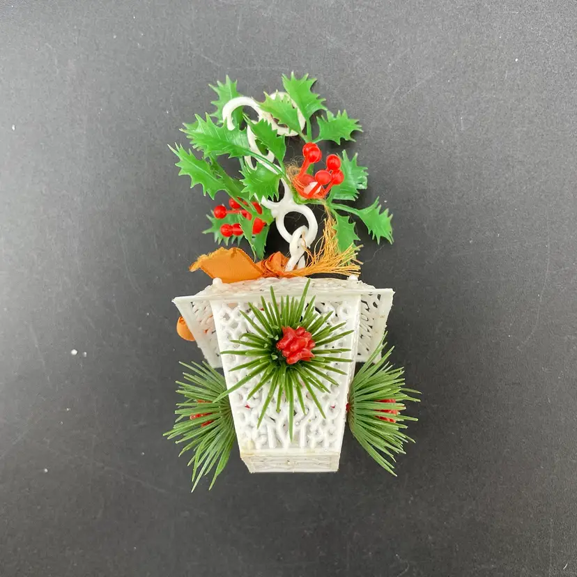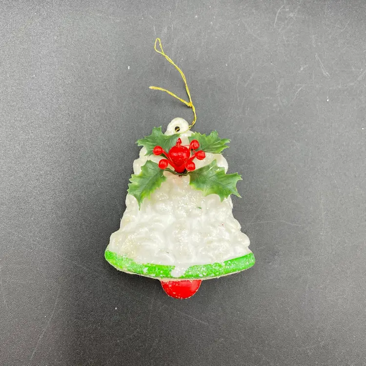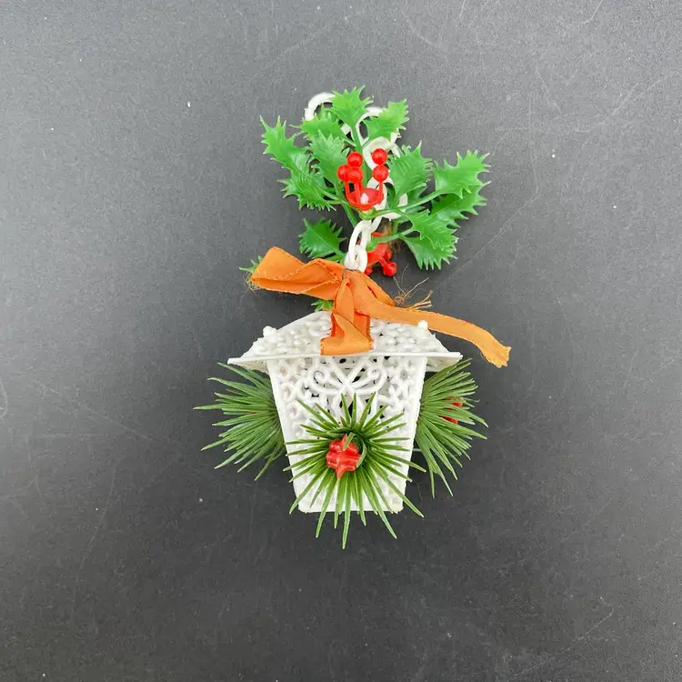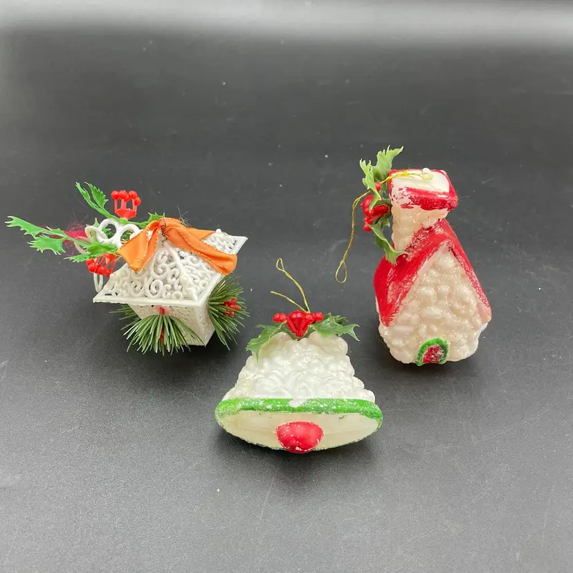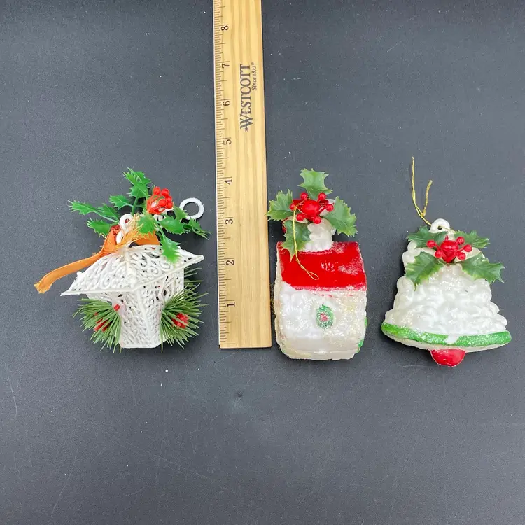 This is a lot of 3 vintage plastic hanging ornaments. The bell and house are blow molds. The lantern is reticulated plastic, and was either part of a garland or a light cover. Each ornament measures approximately 3" long. No cracks or other major flaws.