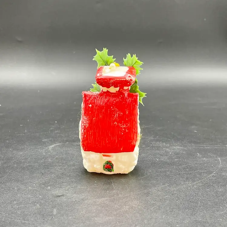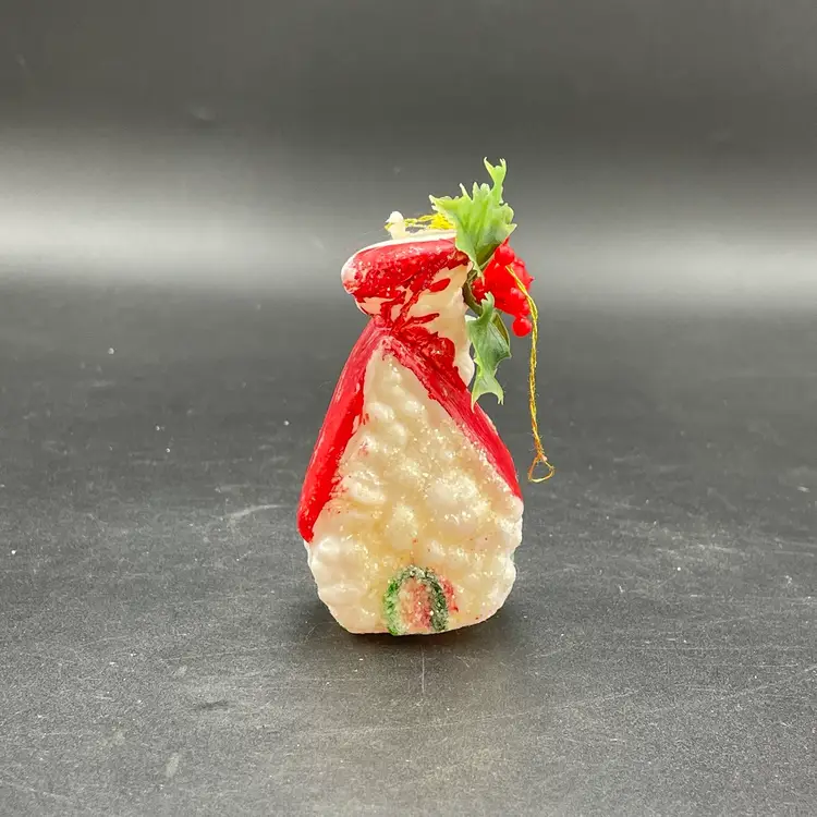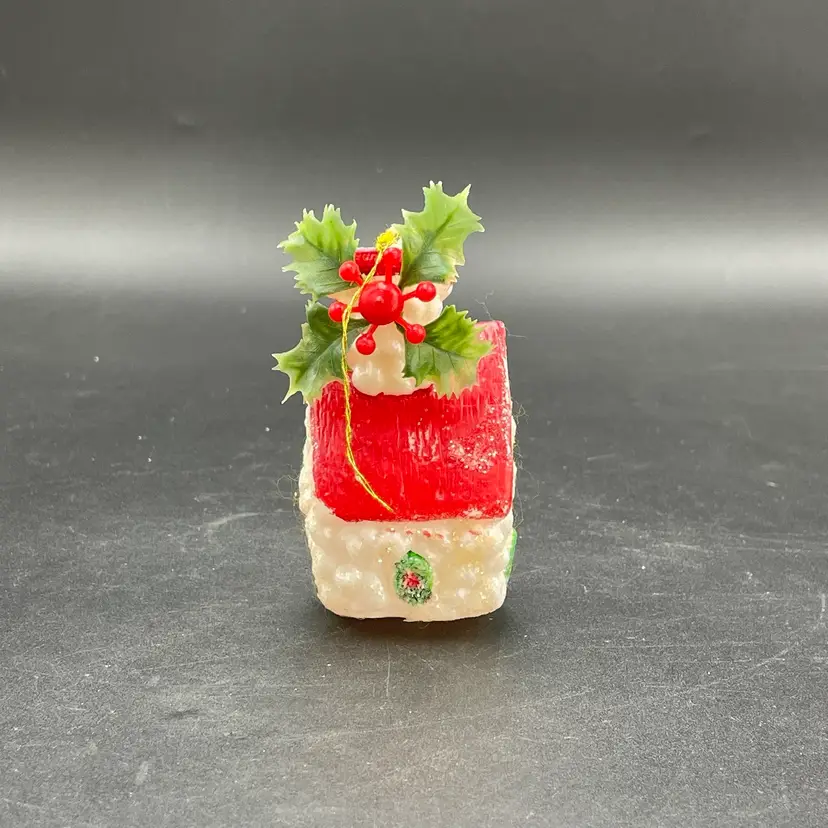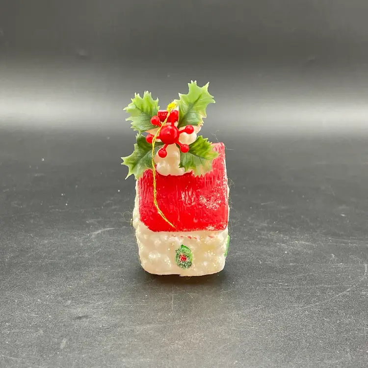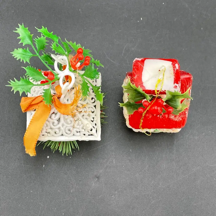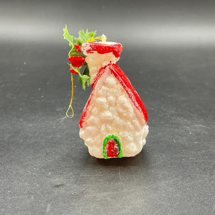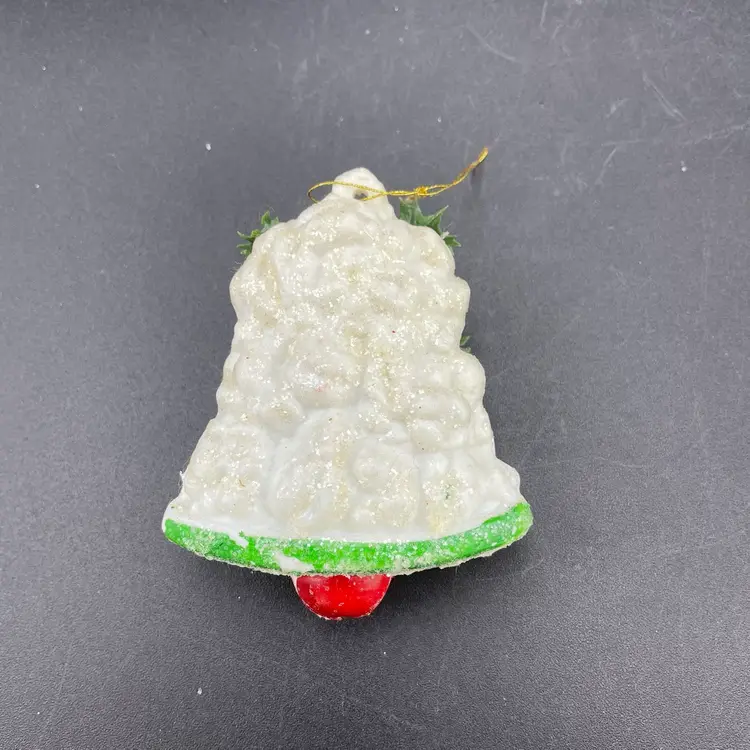 This is a lot of 3 vintage plastic hanging ornaments. The bell and house are blow molds. The lantern is reticulated plastic, and was either part of a garland or a light cover. Each ornament measures approximately 3" long. No cracks or other major flaws.