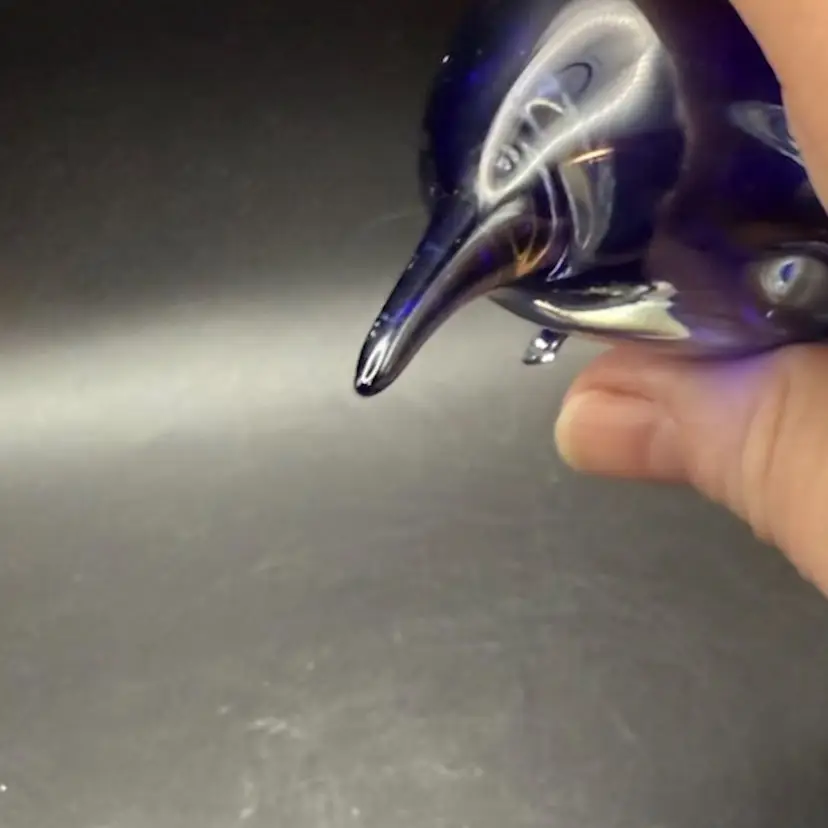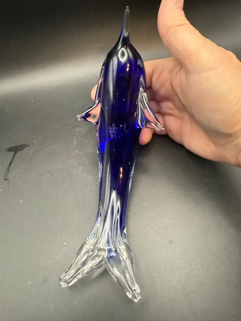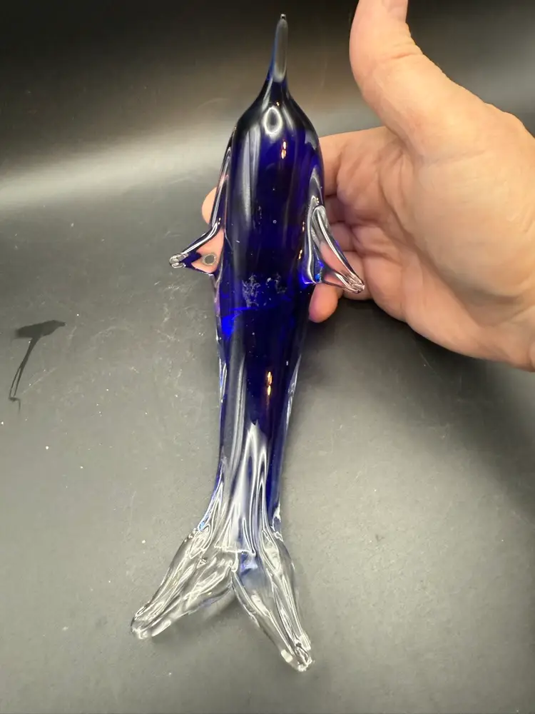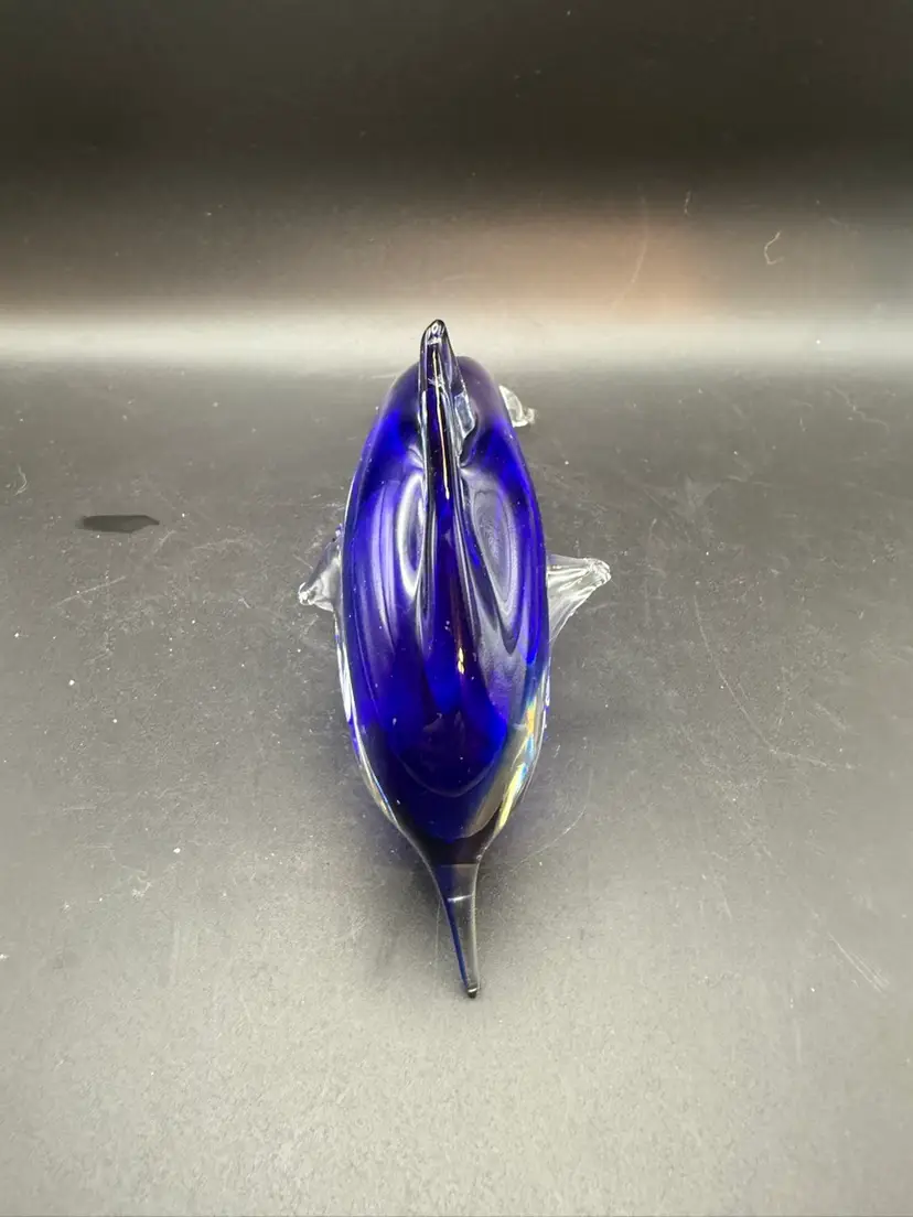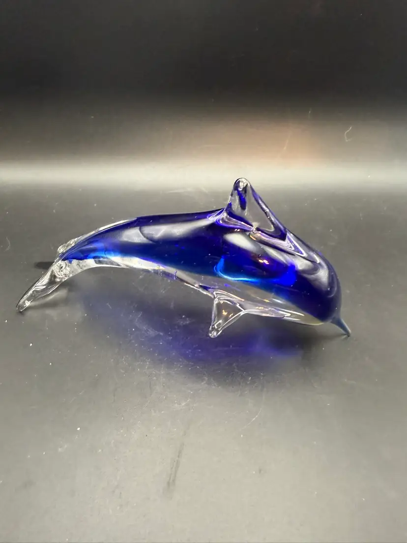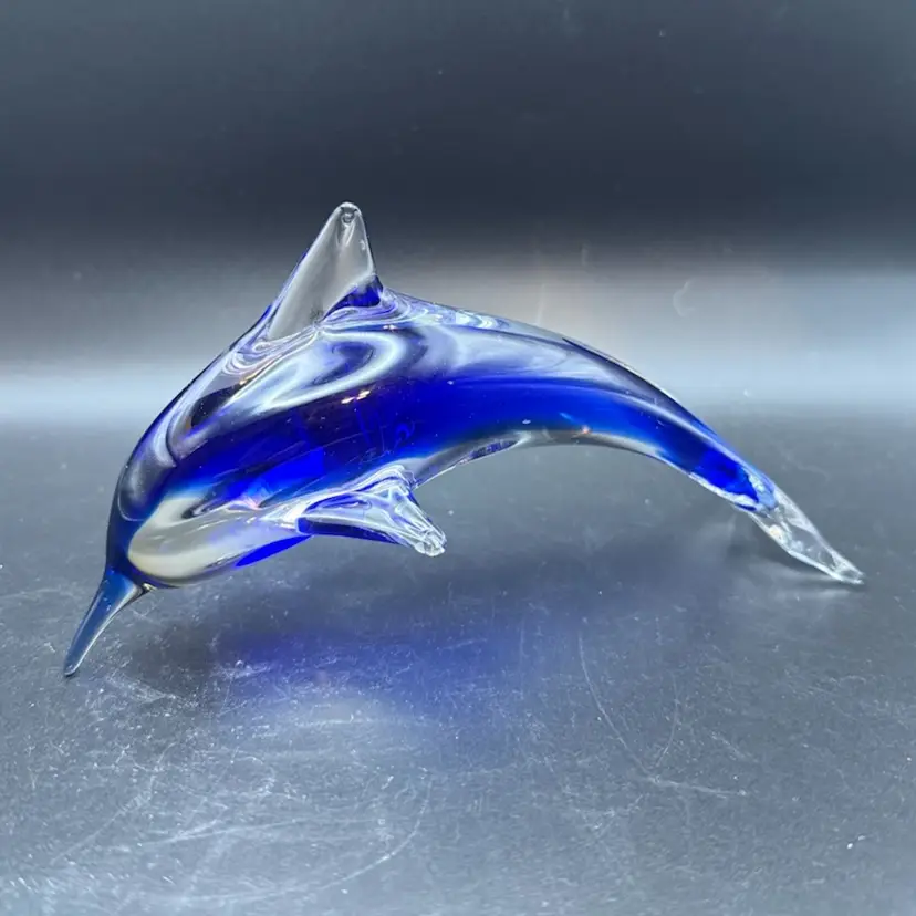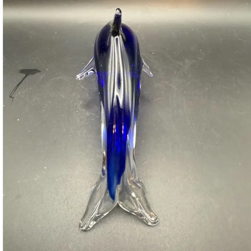 This particular dolphin sculpture, with its striking blue and clear glass composition, exemplifies the decorative art glass trend. Such pieces are often created as paperweights or standalone decorative items. Is 7 in long.