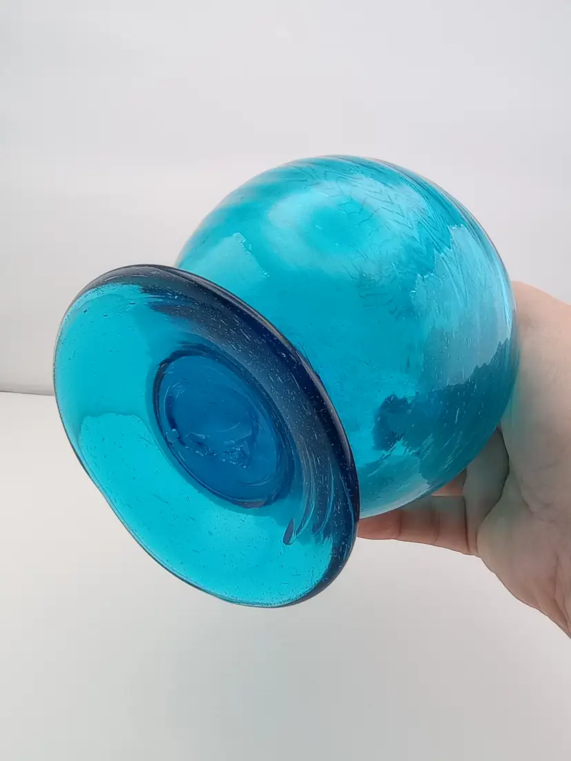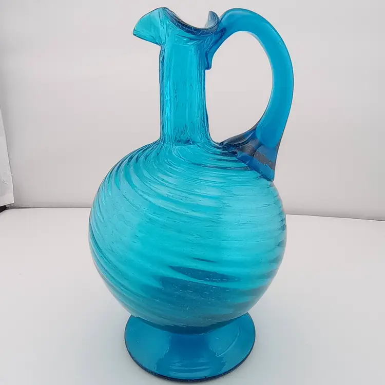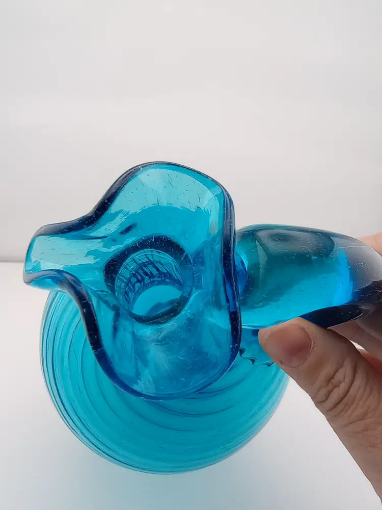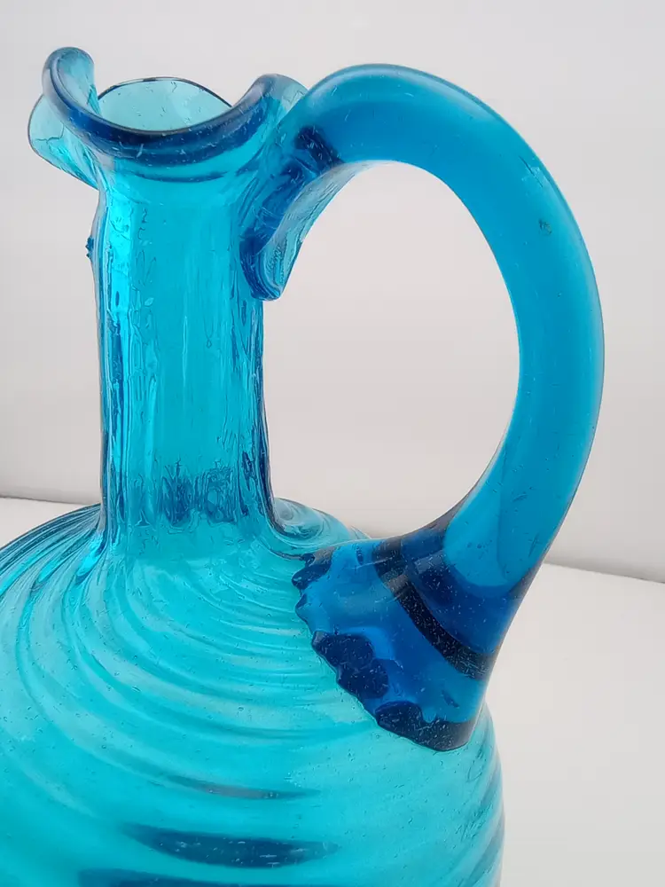 I believe this MCM piece is Italian and is meant to be a cruet but it has no stopper. On its own, however, it makes a lovely bud vase or display piece. The rich turquoise color is exquisite in the light and the optic swirls give the piece such depth. It has some heft and at 7.5" tall, makes a statement on your table or shelf.