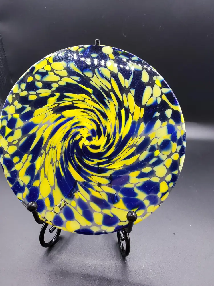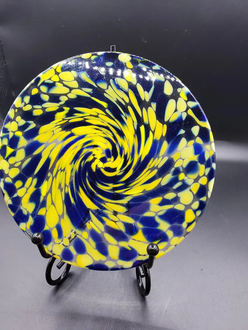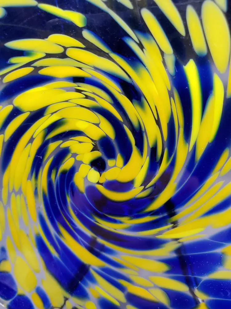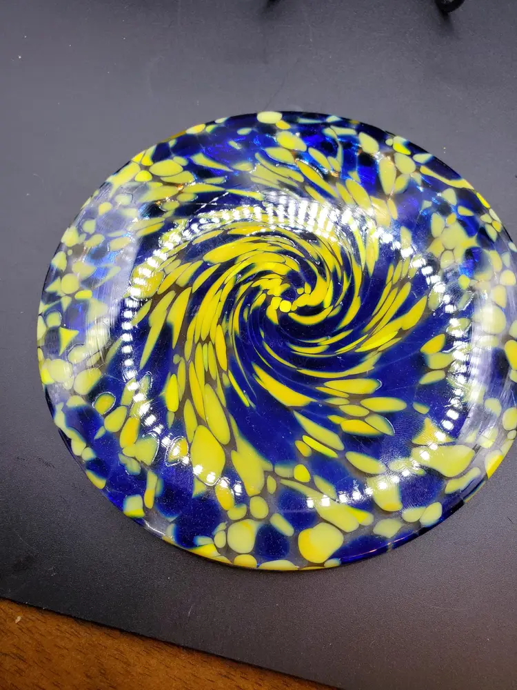 Pretty swirl design with cobalt and yellow. Cased as well in clear. 5 1/2" round.
