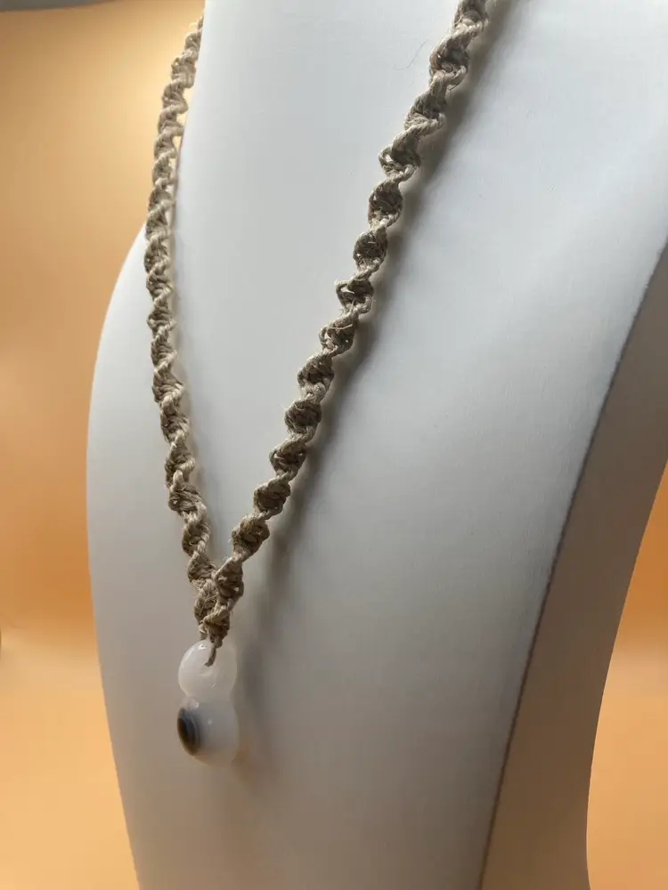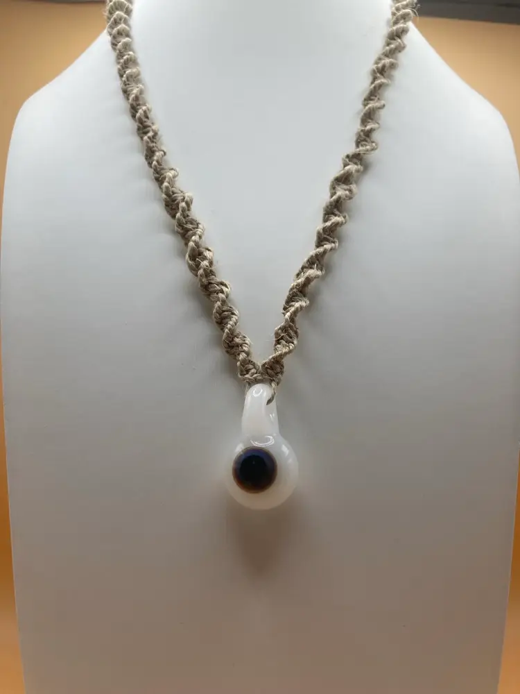 Handmade hemp necklace features a hand blown glass eye. The pendant is a blue eye with a black pupil. Necklace features a bead and loop toggle style closure. Necklace measures 20 inches.