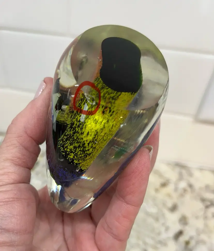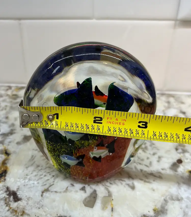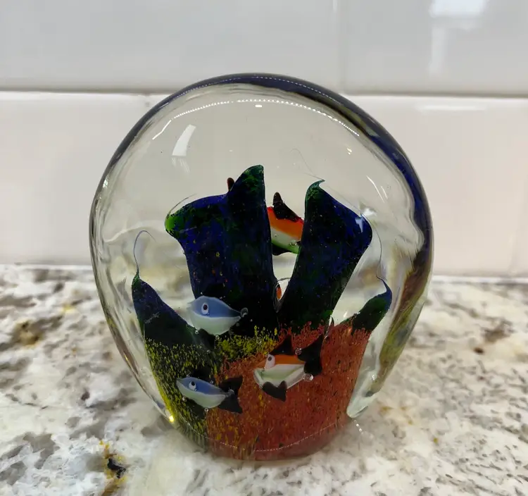 Beautiful paperweight with swimming fish. 4” tall x 3” wide. Small chip on bottom. See pics.