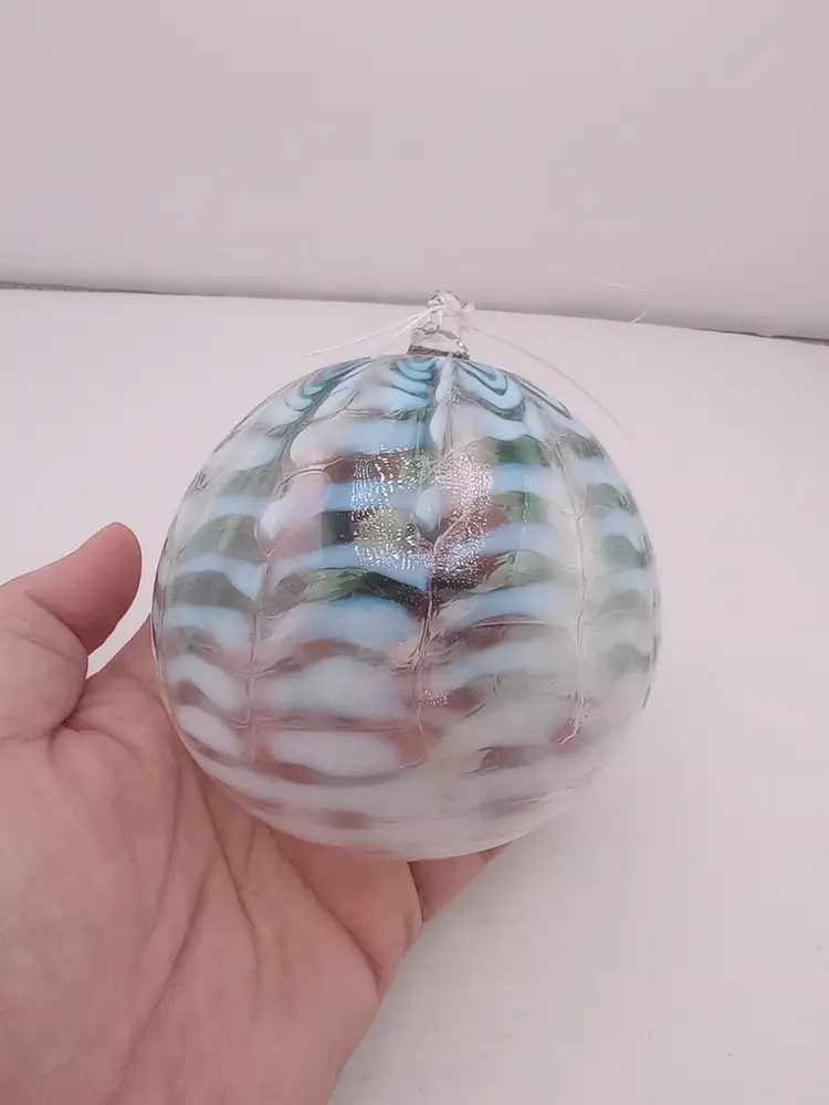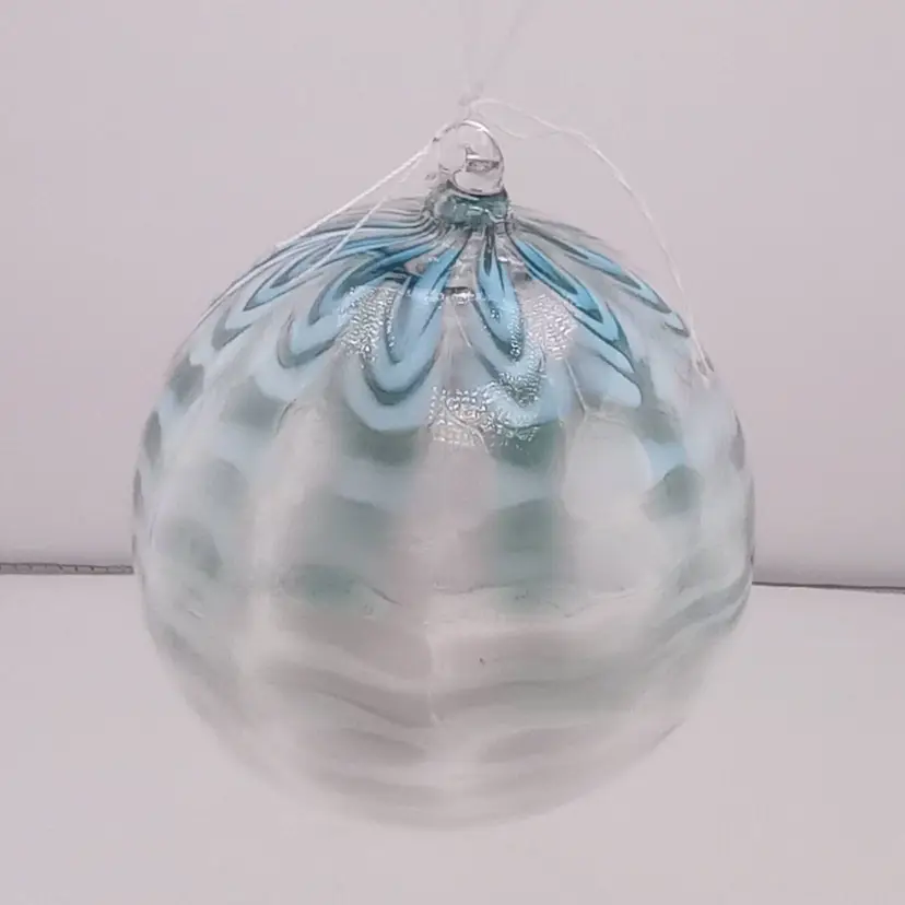 This is a very pretty blown glass orb/ornament with delicate blue and white decoration. It's in excellent condition with no damage.