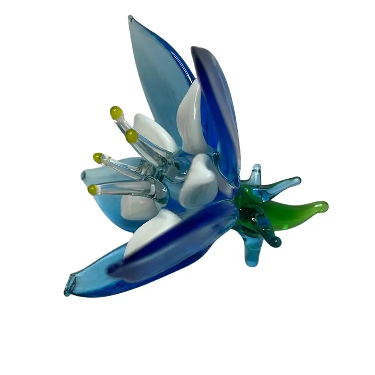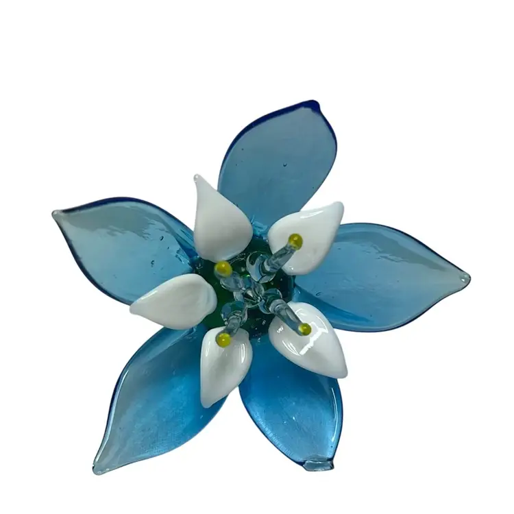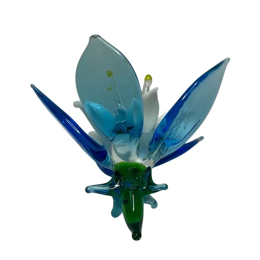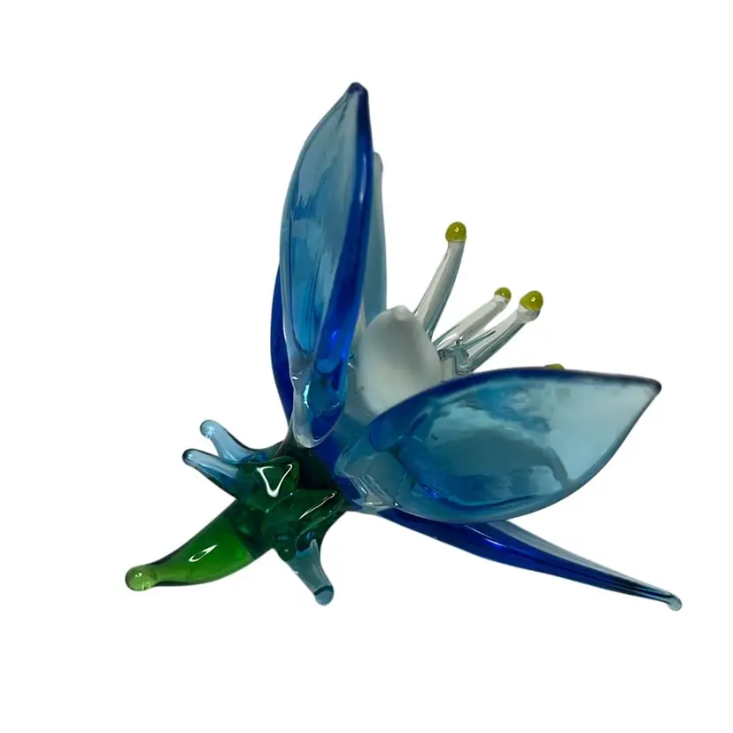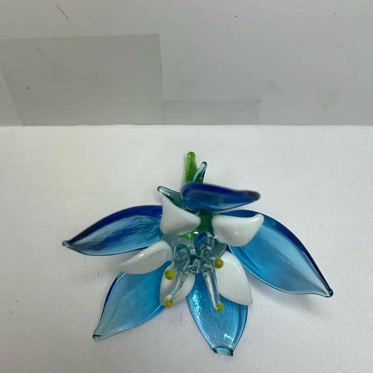 Beautiful delicate flower of blues & yellow with white center petals. Has one blue petal that has the very small tip chipped off. Hard to see, but I did feel it. Measures 2.5” long & 3” wide