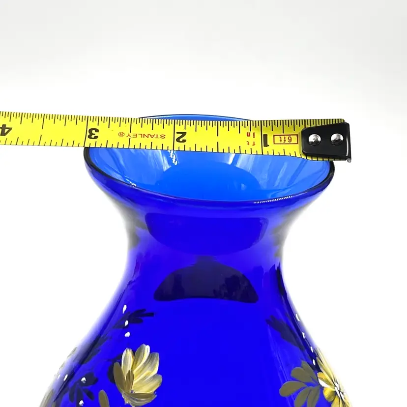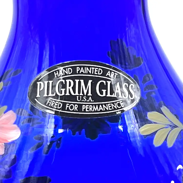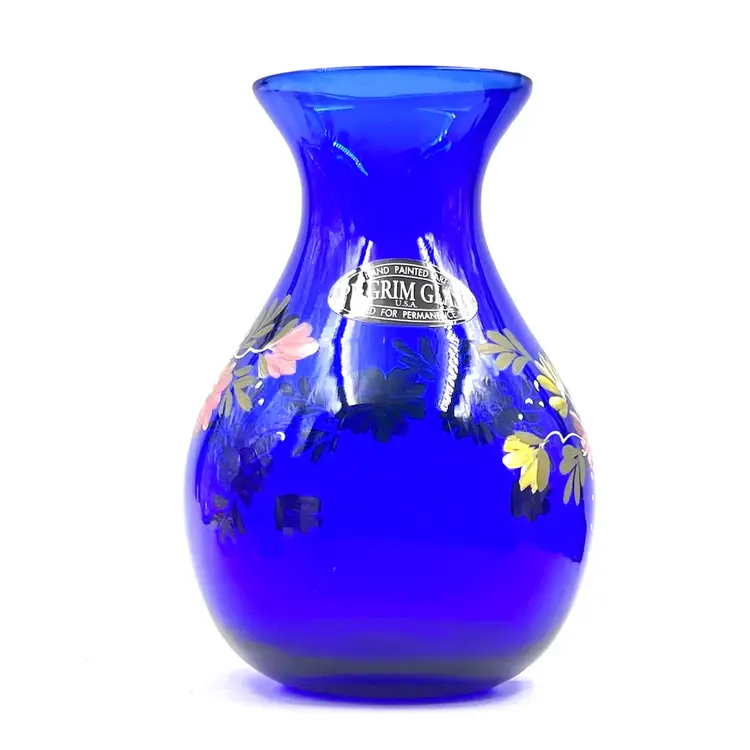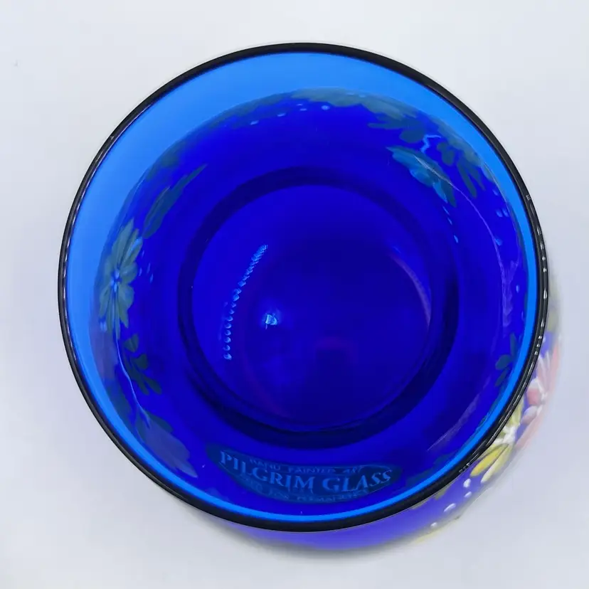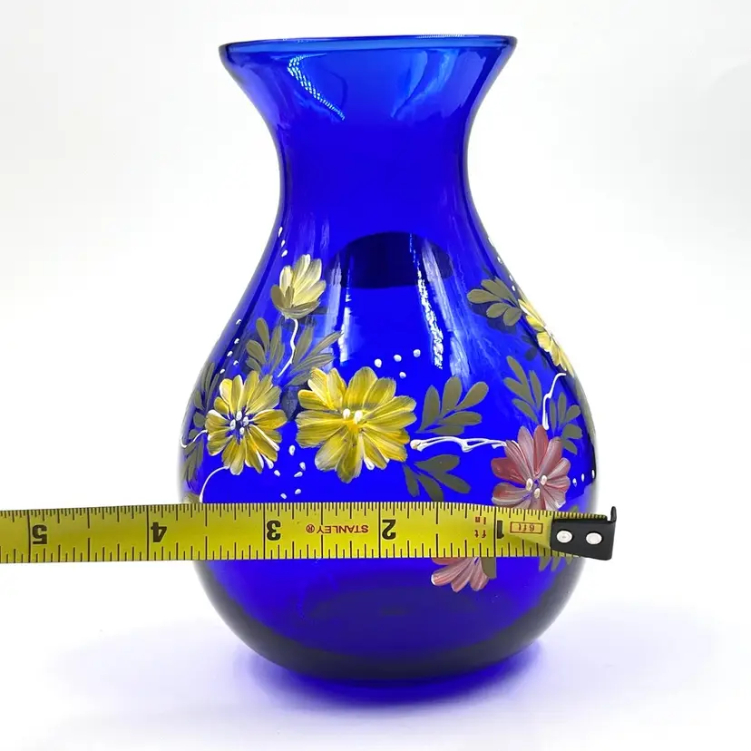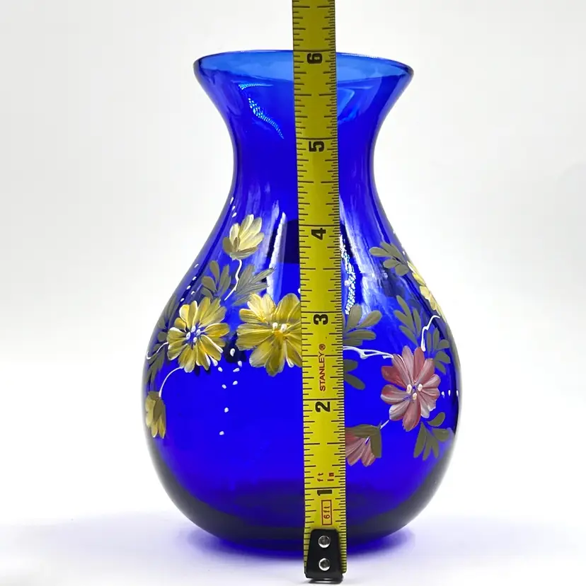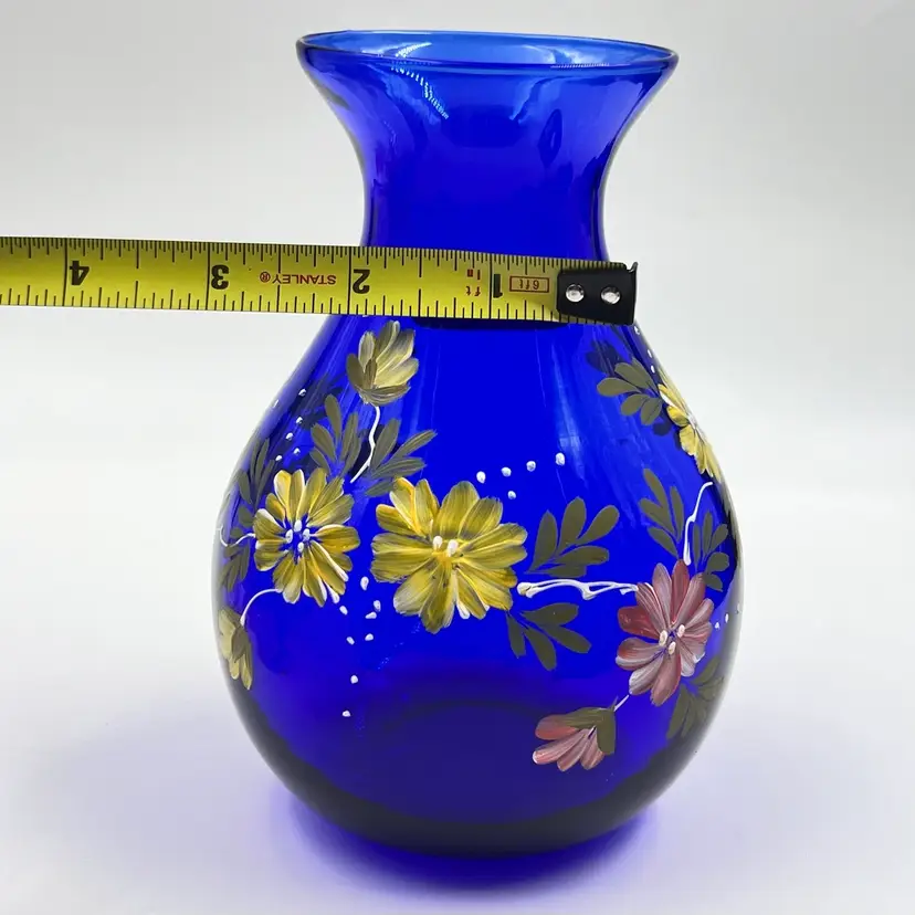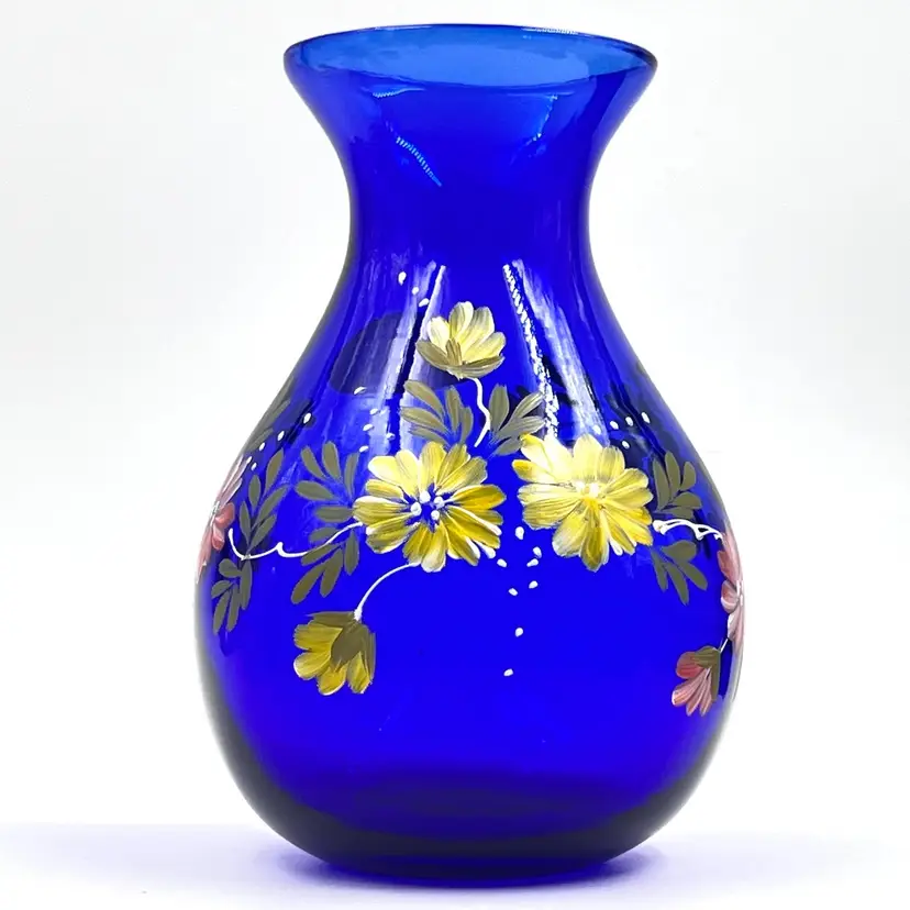 Beautiful Cobalt Blue with Hand Painted Pink & Yellow Flowers with Leaves Greenery 👉Original Sticker 👉5 1/2”L x 3 3/4“W 3” Opening 👉Shipping Overages <$1 Refunded 👉No Chips or Cracks 👉 Review Photos for Best Condition Description 👉 Sold as Shown