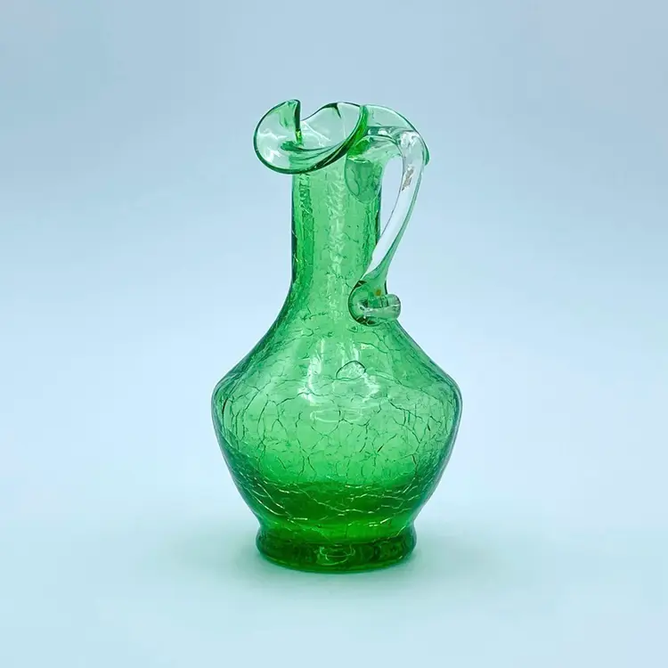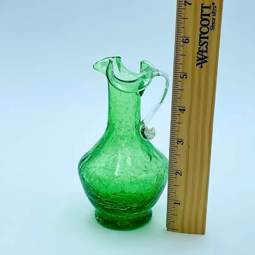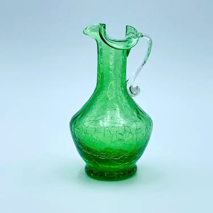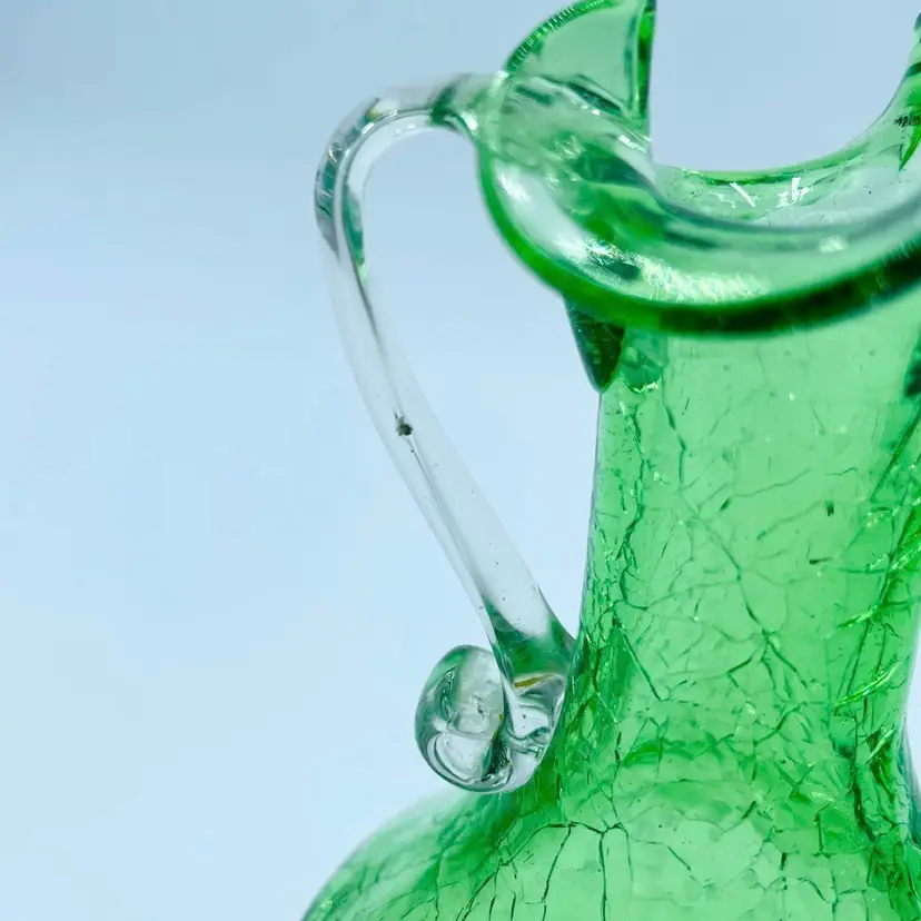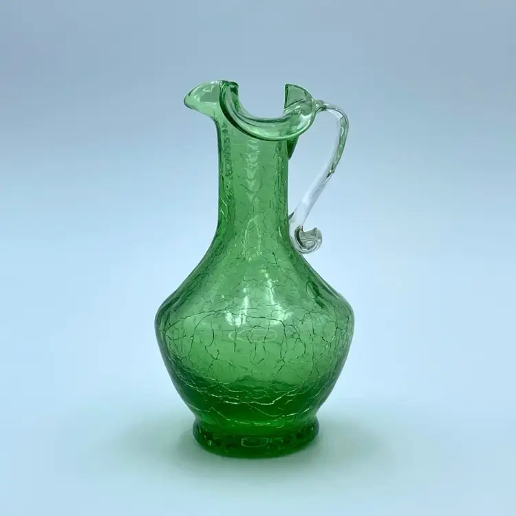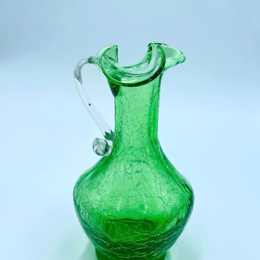 This is a vintage green blown crackle art glass cruet/pitcher/jug with a clear applied glass handle. Measures approximately 5.5" tall. There is a rough maker's flaw on the handle as shown in picture 10. No chips or cracks. #GGT