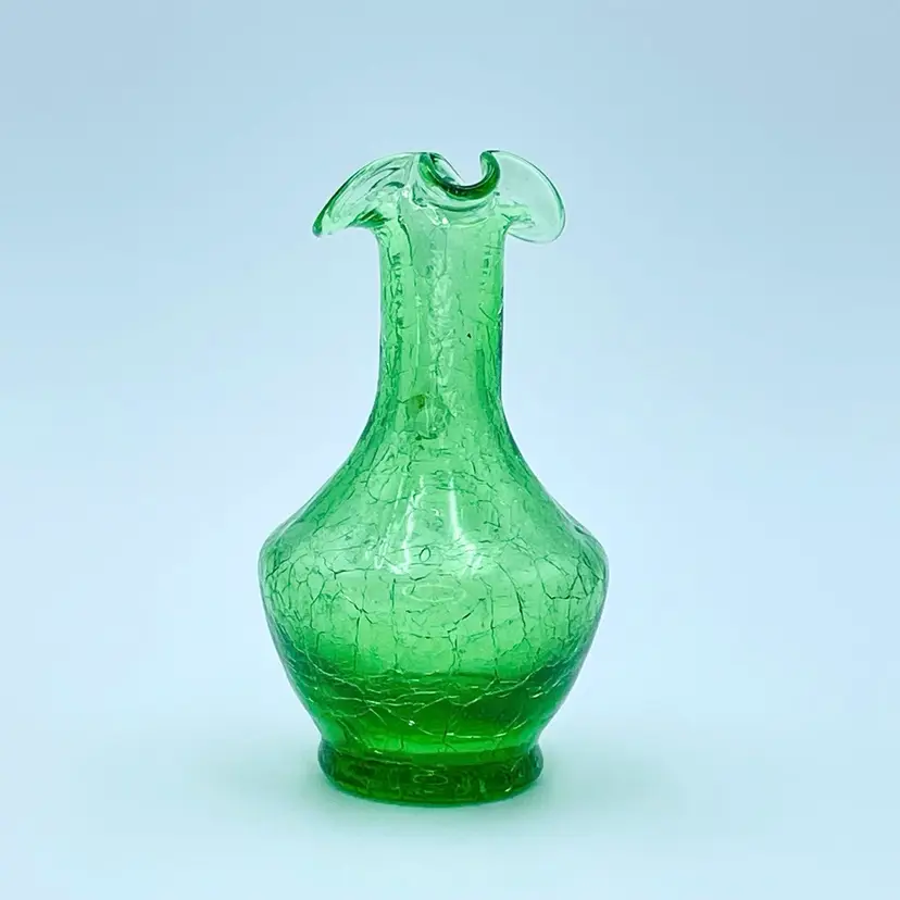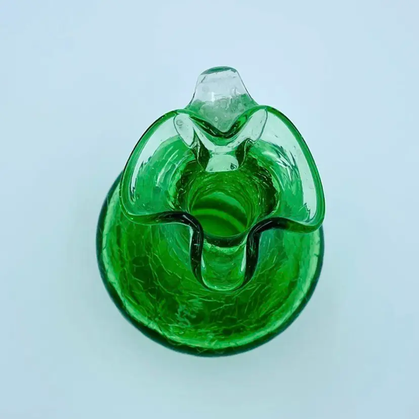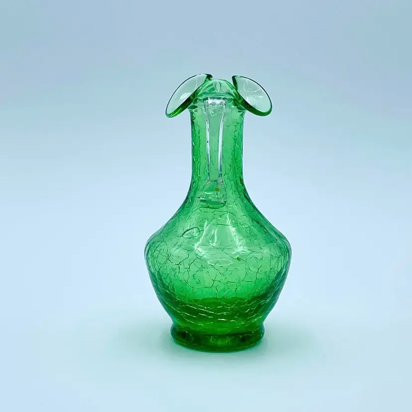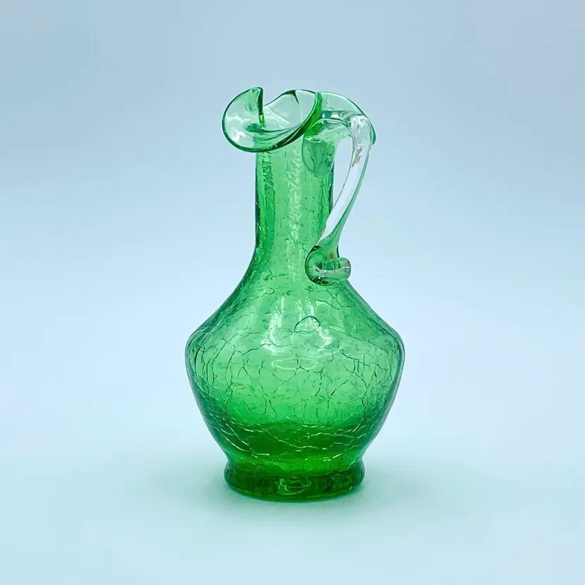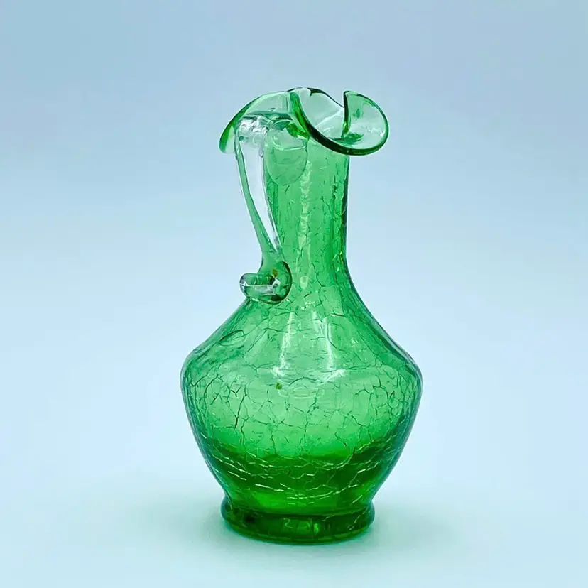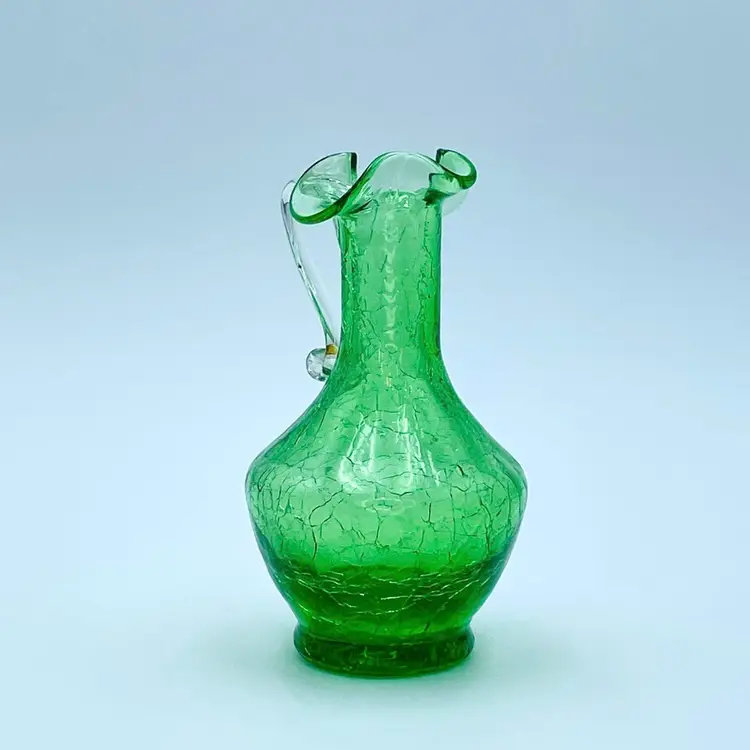 This is a vintage green blown crackle art glass cruet/pitcher/jug with a clear applied glass handle. Measures approximately 5.5" tall. There is a rough maker's flaw on the handle as shown in picture 10. No chips or cracks. #GGT