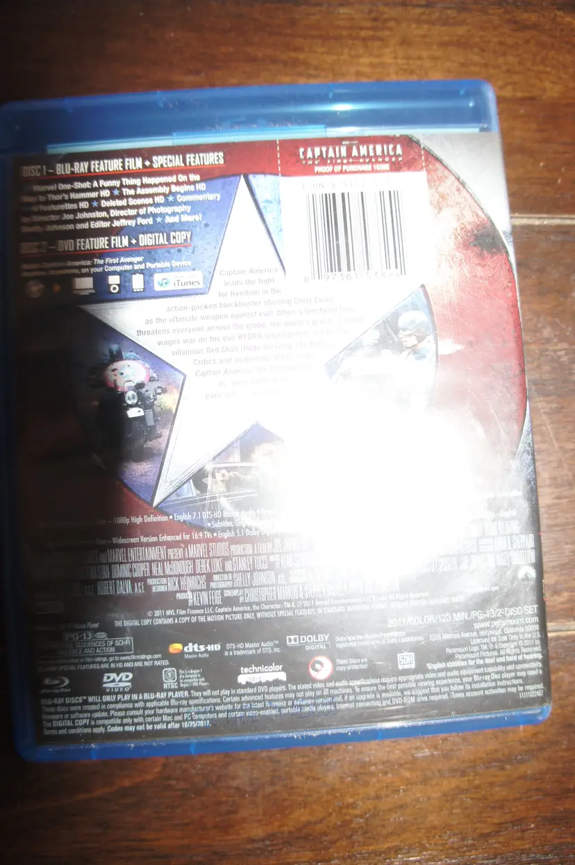 Listed is a BLU-RAY Marvel Studios 2 disc digital DVD - Captain America ' The First Avenger, with special features and original promo/ info sheet. Disc play surface, the back; is like new. #15382. Thanks for lookin'