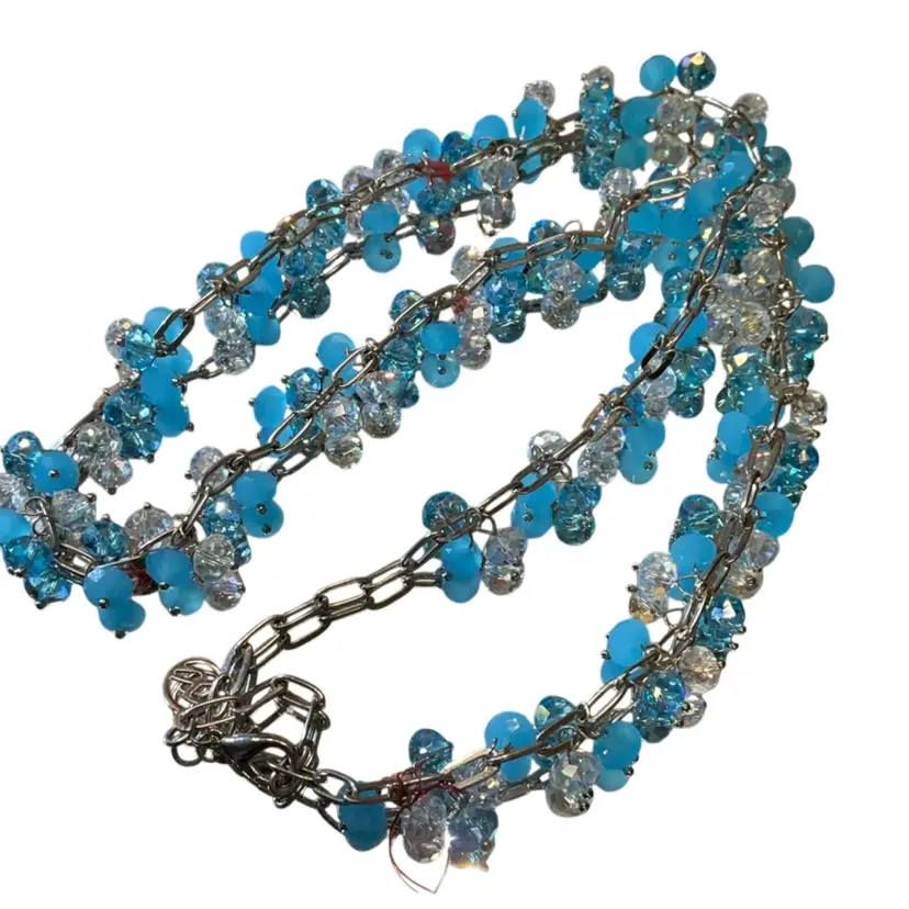 Silver tone necklace with blue and AB rhinestones done in a cluster throughout. Measures 14”. Lobster claw clasp.
