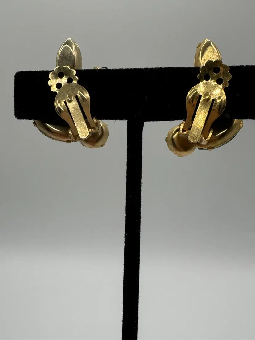 Blue And Green Rhinestones Prong Set On Gold Tone Clip On Earrings 1.25” length Good Vintage Condition