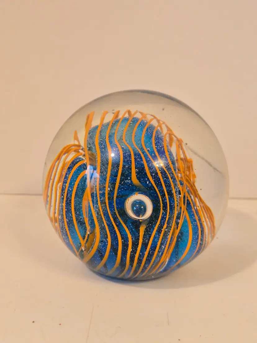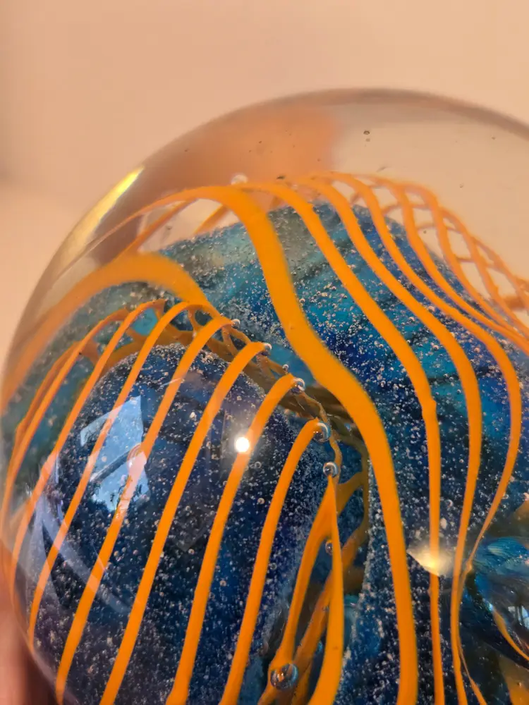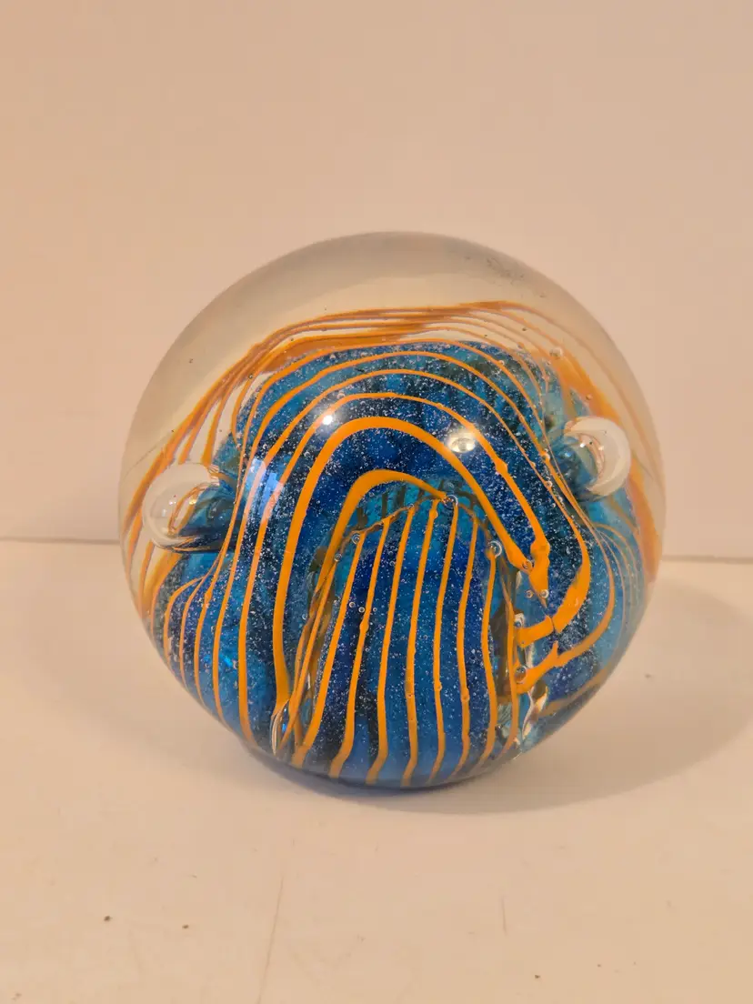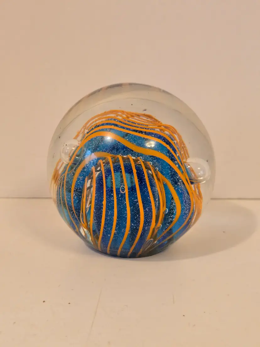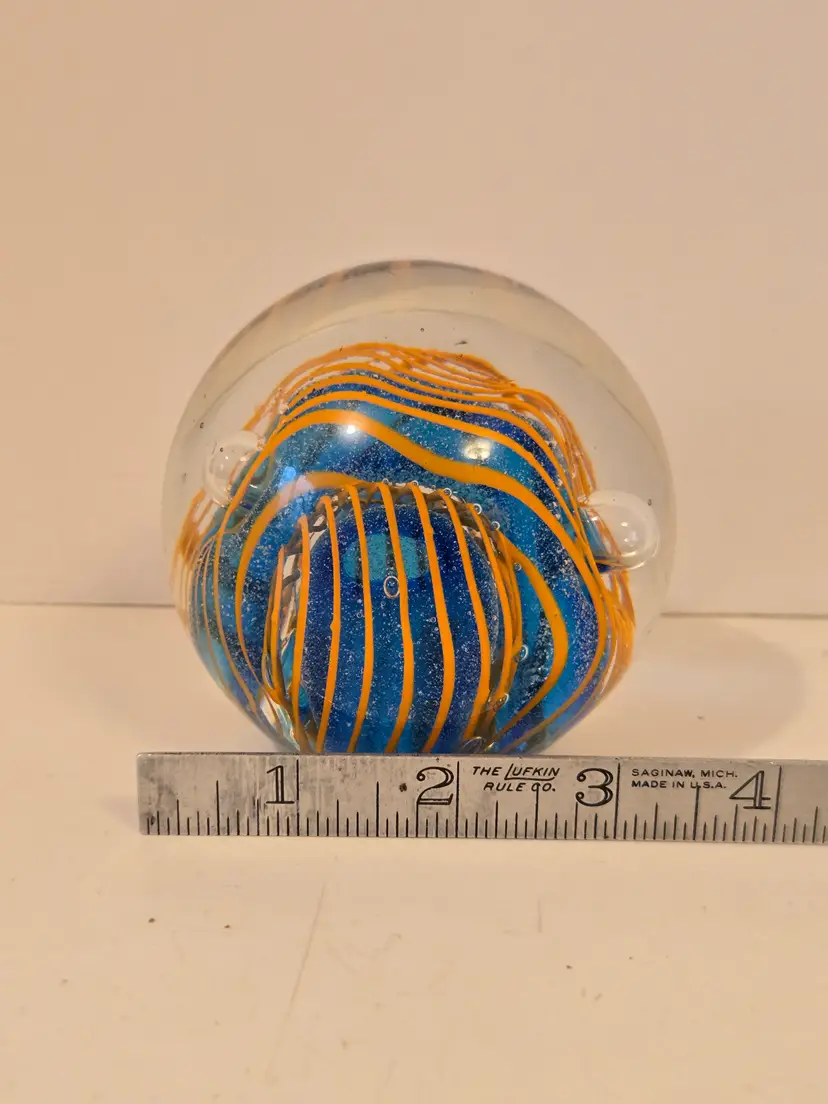 Blue and Orange Art Glass Paperweight Controlled Bubbles Unsigned