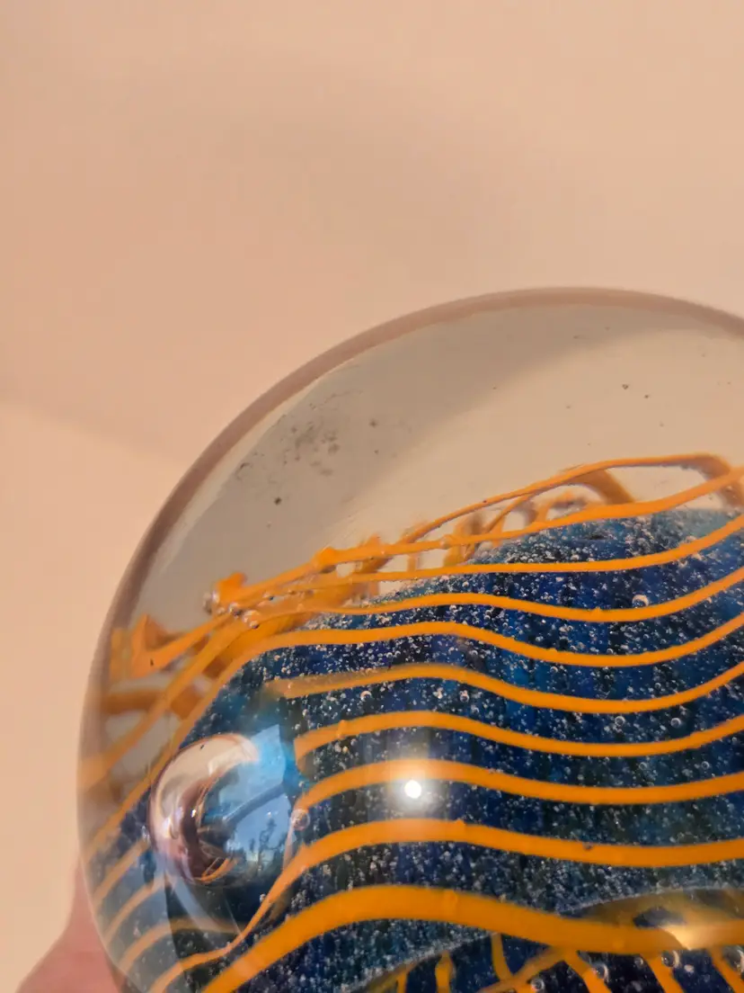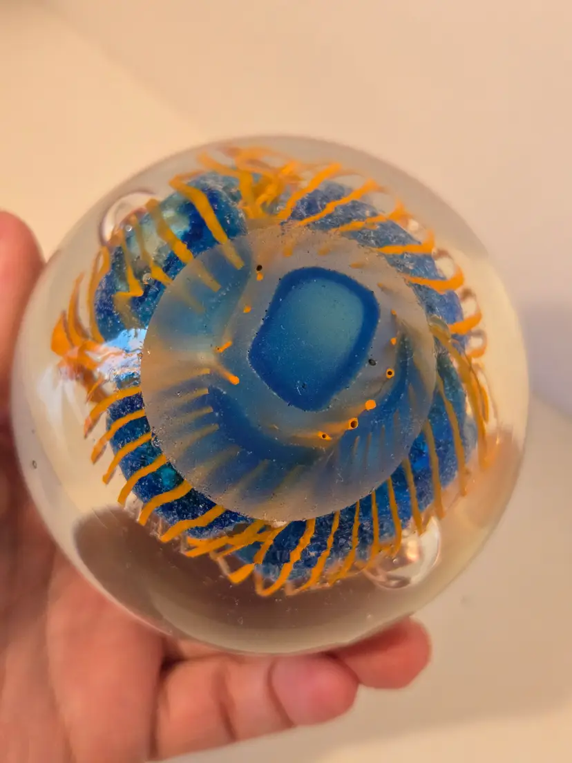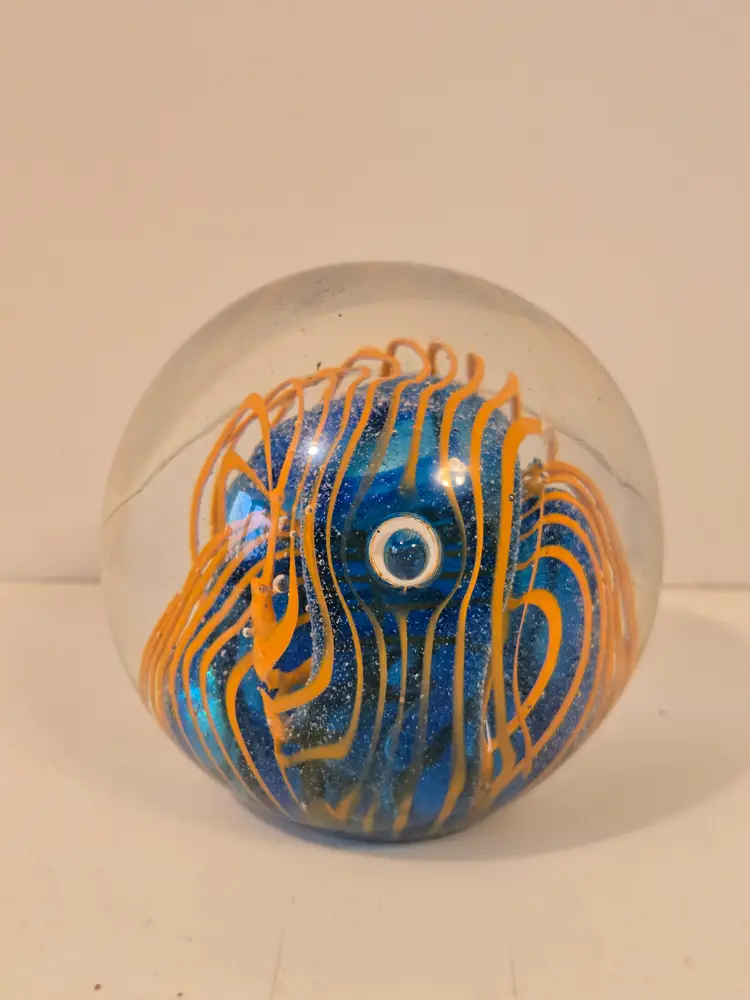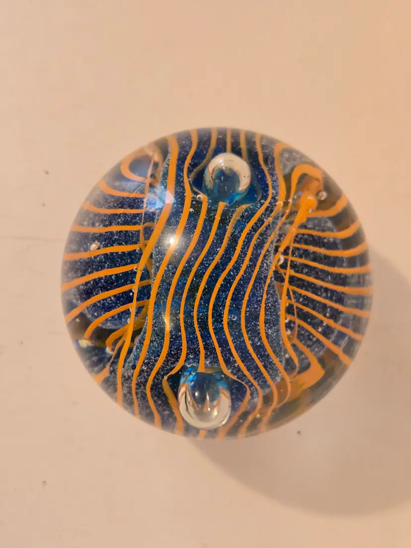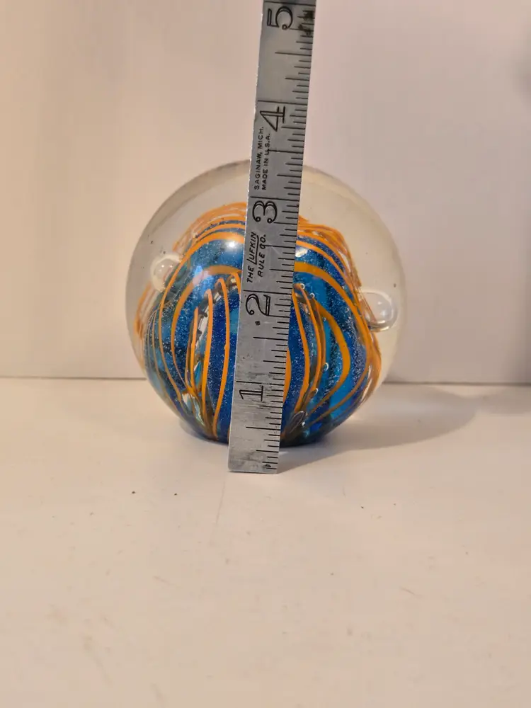 Blue and Orange Art Glass Paperweight Controlled Bubbles Unsigned