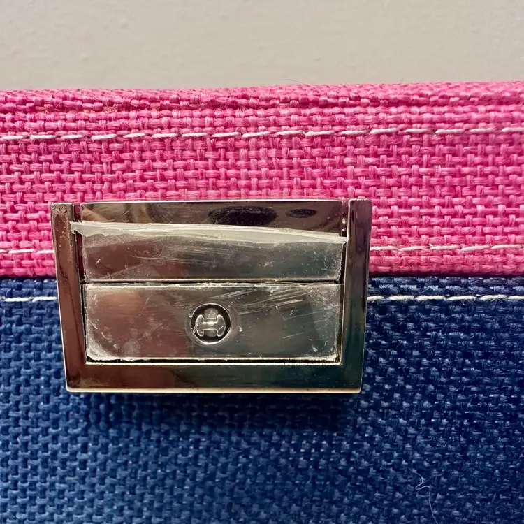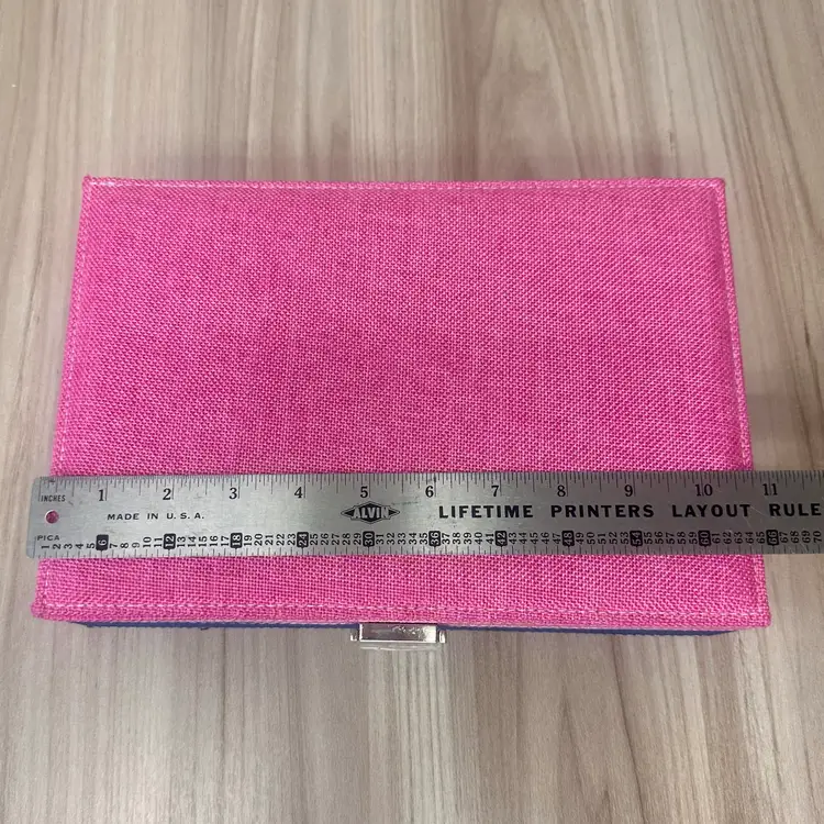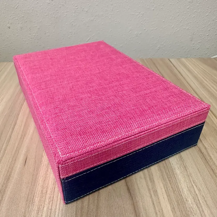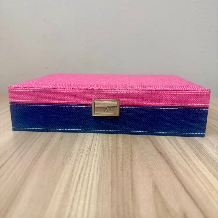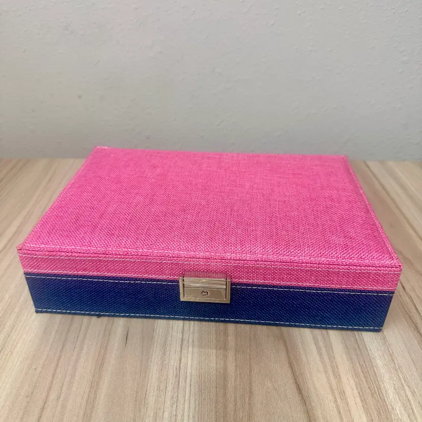 This listing is for this beautiful new without tags blue and pink fabric jewelry box organizer specifically designed for storing rings. It features silver tone hardware with a lock and key, adding a touch of style and security to the storage. With its elegant design and practicality, this jewelry box is perfect for organizing and storing your favorite rings in a stylish and secure manner.