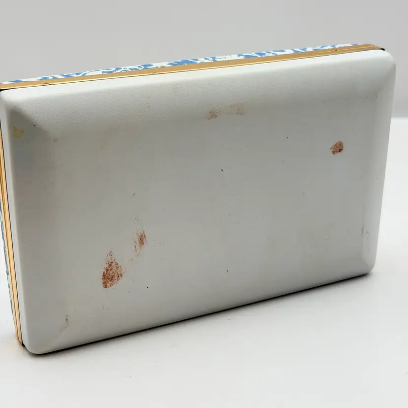 As shown 1.5 inches tall by 5 inches long No tears colored marks on bottom