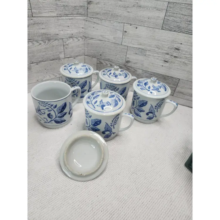 Elegant blue and white porcelain tea mug featuring a beautiful floral design and a matching lid. Perfect for keeping your tea warm and adding a touch of classic charm to your kitchen. Ideal for tea lovers and collectors of fine china. This is for one cup and lid set; there are 2 available.