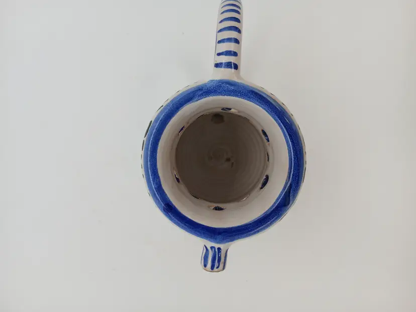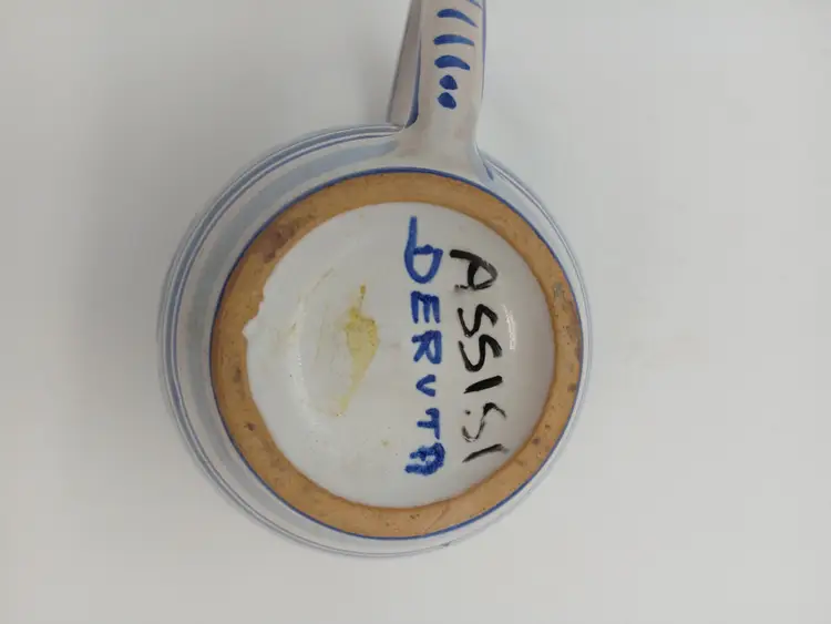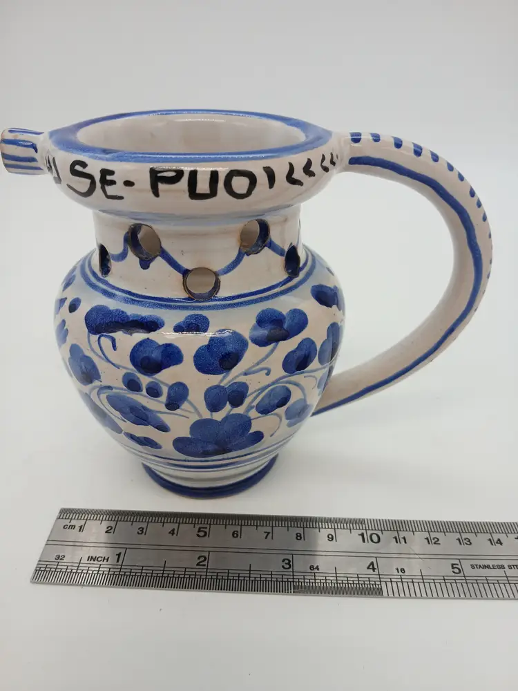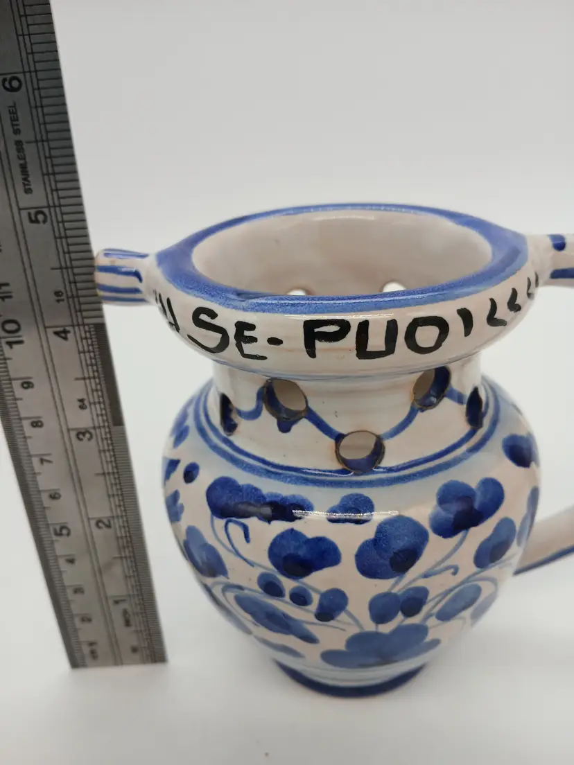 Precious little Italian pottery pitcher decorated with a bird and berries. About 5" Tall. The holes in the neck of the pitcher would present a challenge for anyone trying to drink from it!