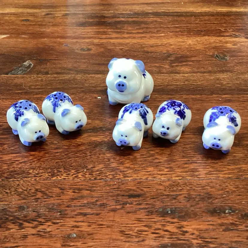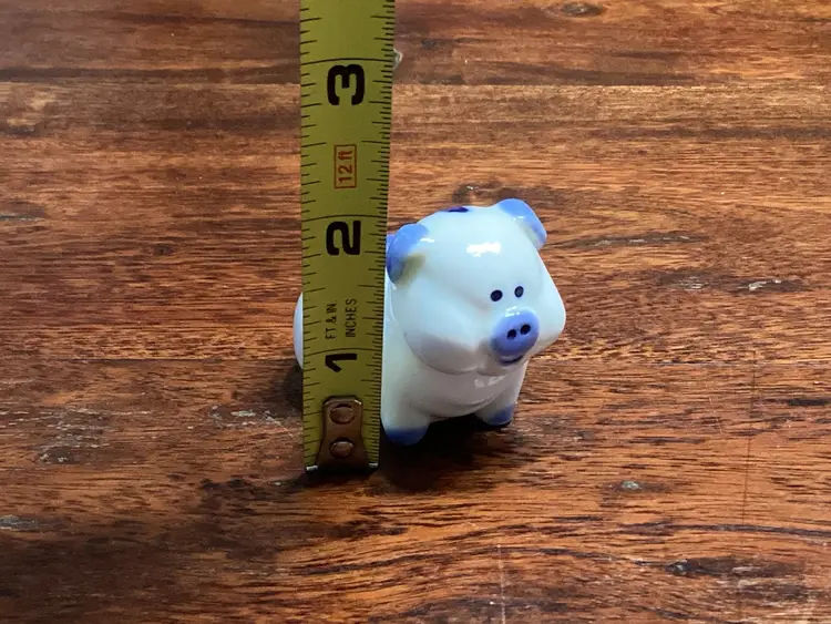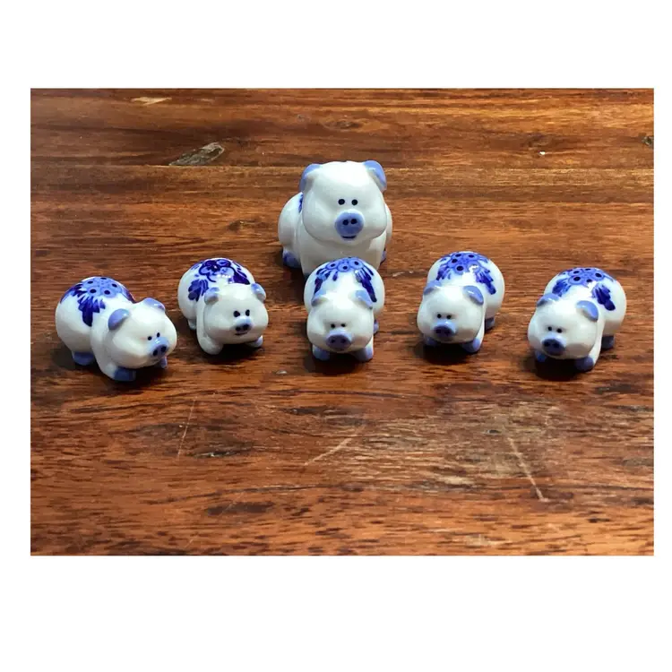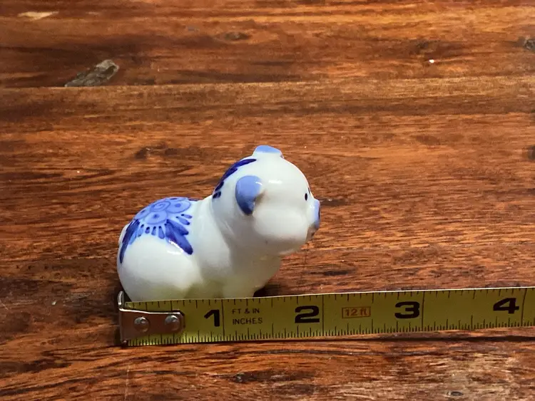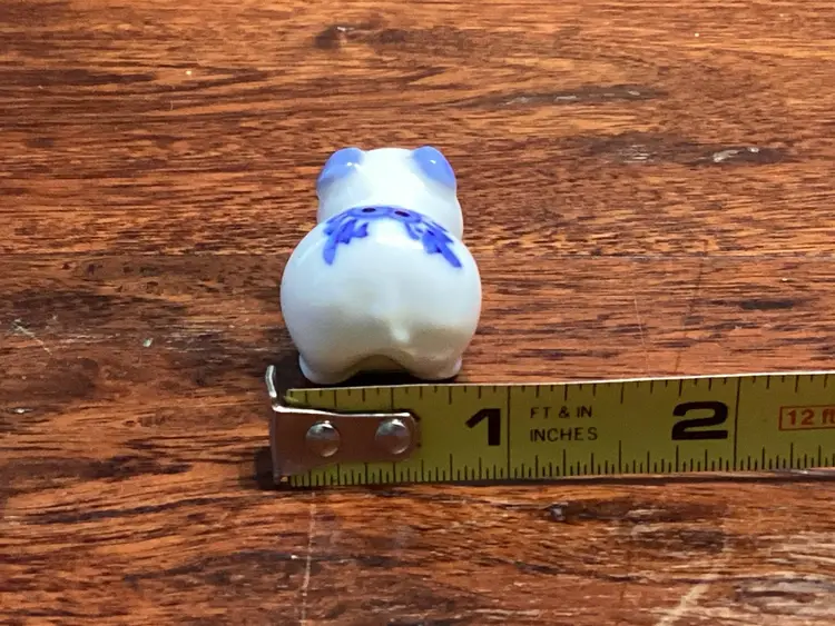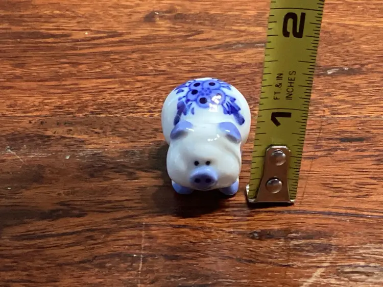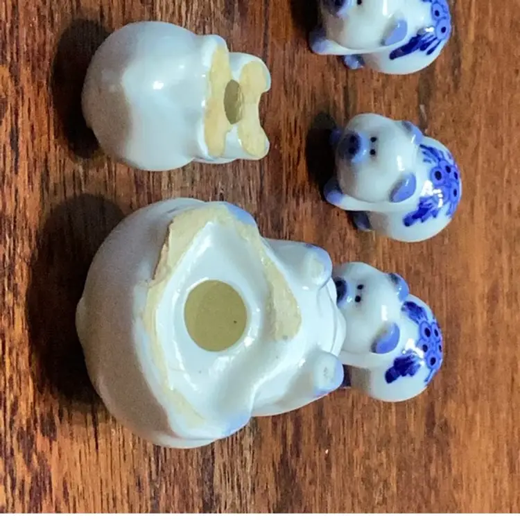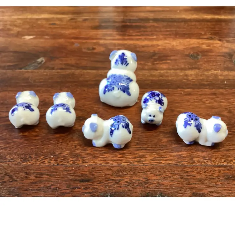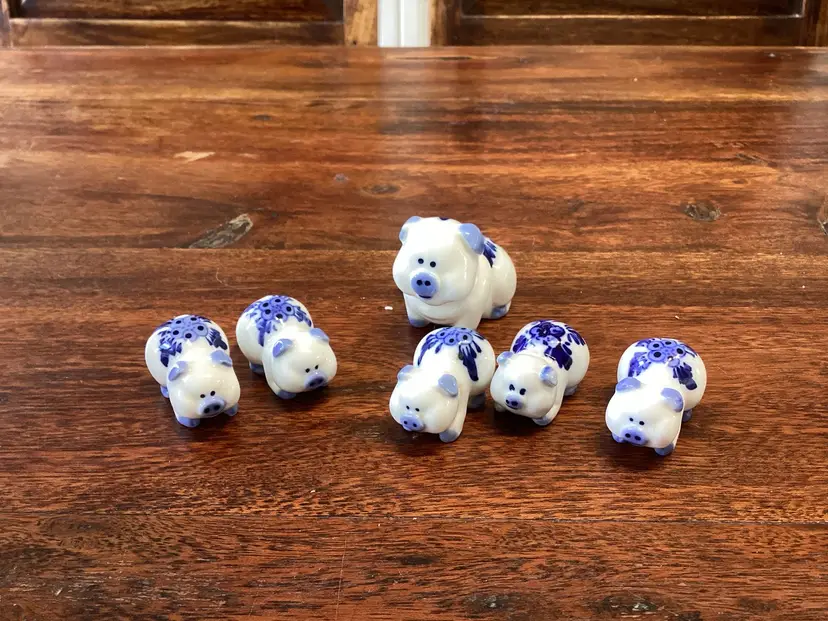 This cute little family of pigs are ready to sit in your shelf or could be used to rest your chopsticks on. The large pig is 1 3/4 in tall x 2 1/4 in long and 1 1/2 inches wide. The smaller pigs are approximately 3/4 in tall x 1 1/2 inches long and 1 inches wide. No condition issues noted. No makers mark present.