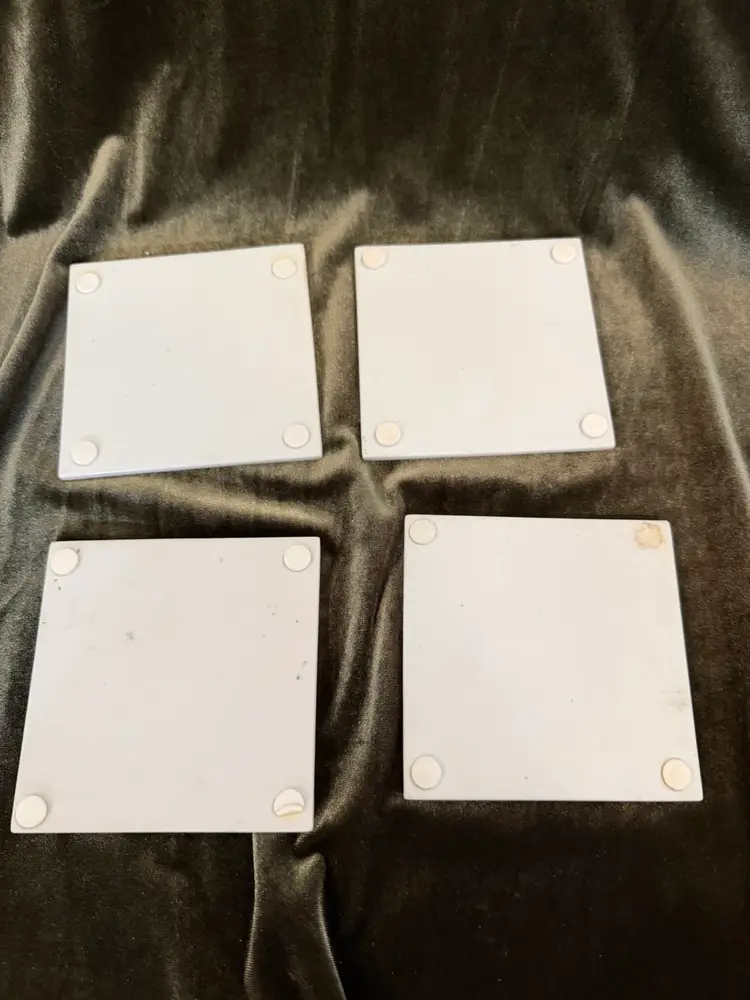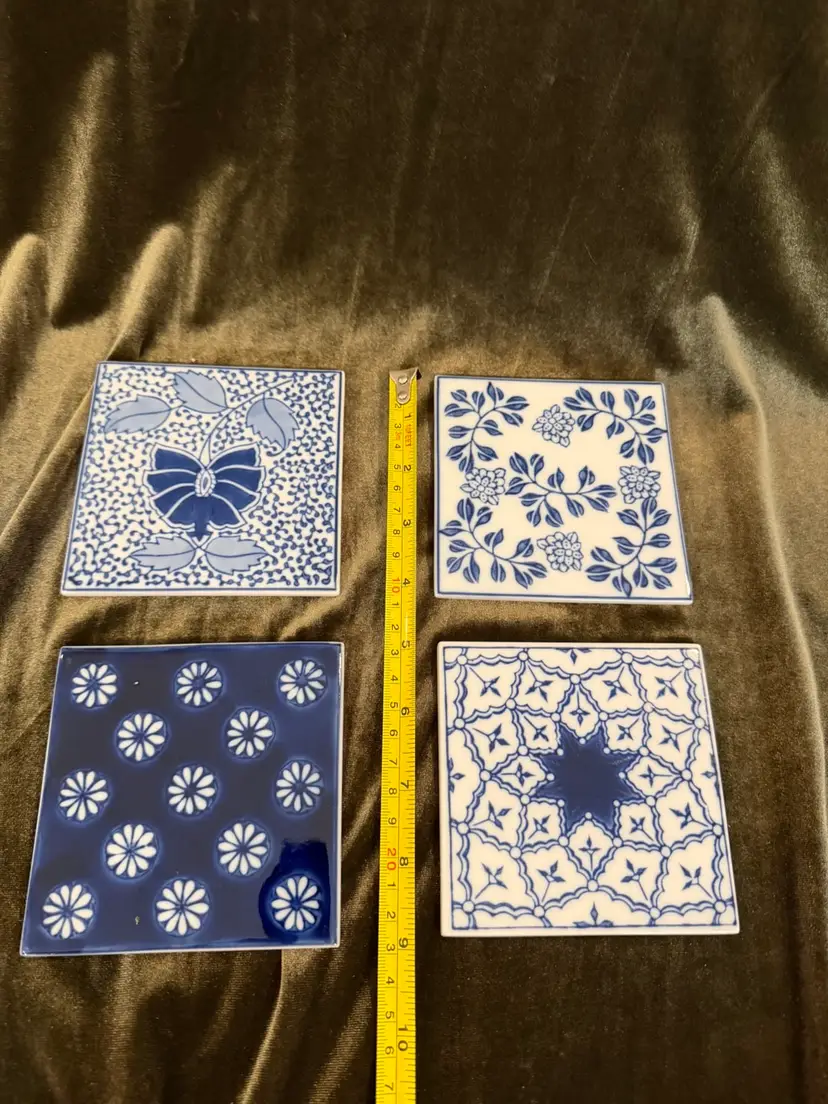 A set of four square ceramic coasters featuring various blue and white transfer-print designs including floral, geometric, and stylized leaf patterns.