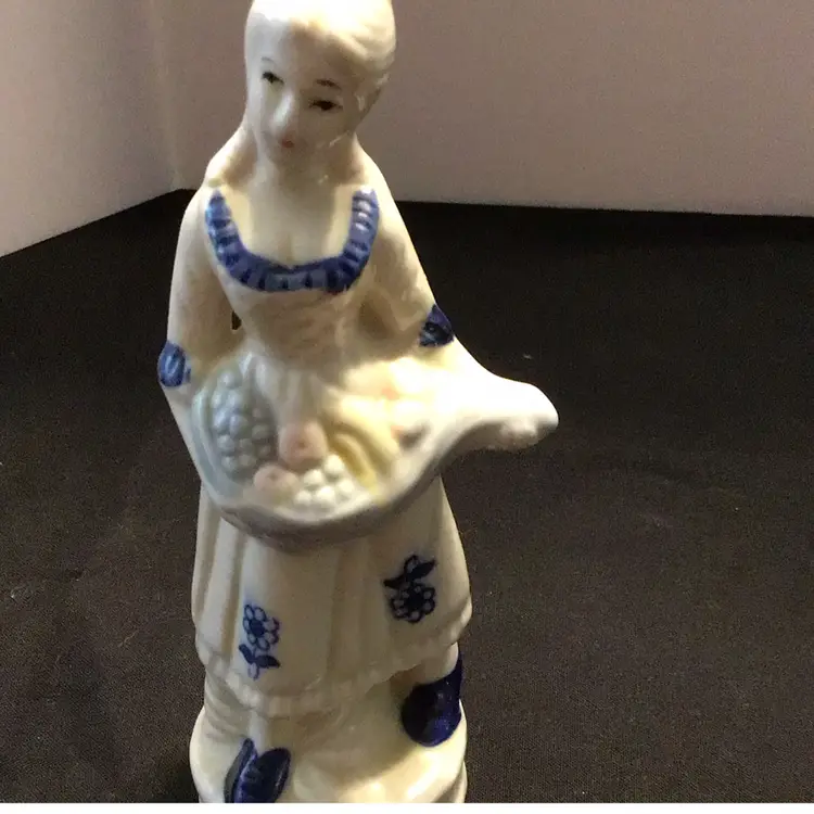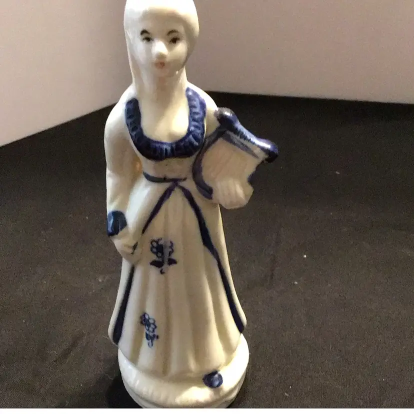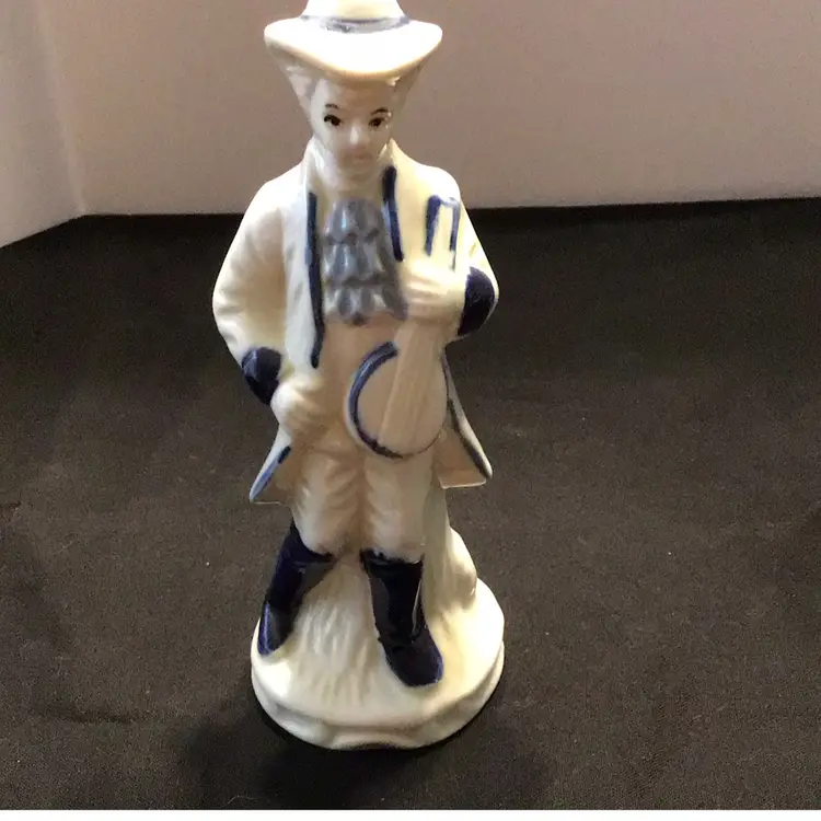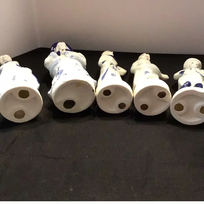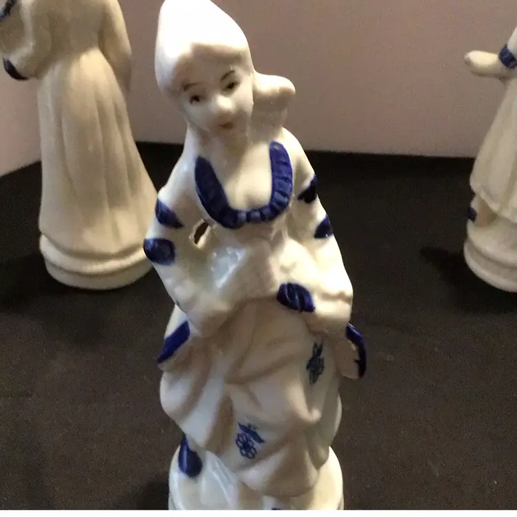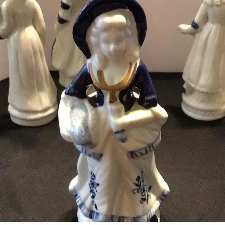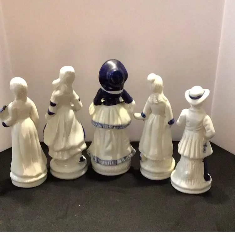 Unmarked white and blue figurines. 4 Victorian Lady and 1 Male