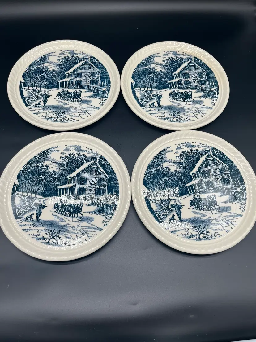Set of 4 transferware 7.5" plates depicting winter scene with horse and sleigh, most likely inspired by Currier & Ives prints. Capture the nostalgic charm of 19th century American winter scenes this season. Made in USA mark on back.
