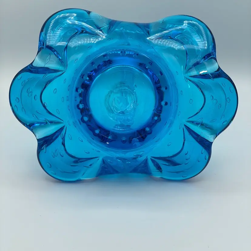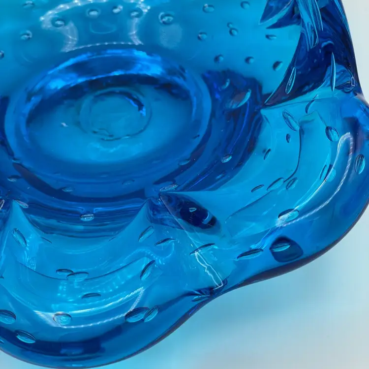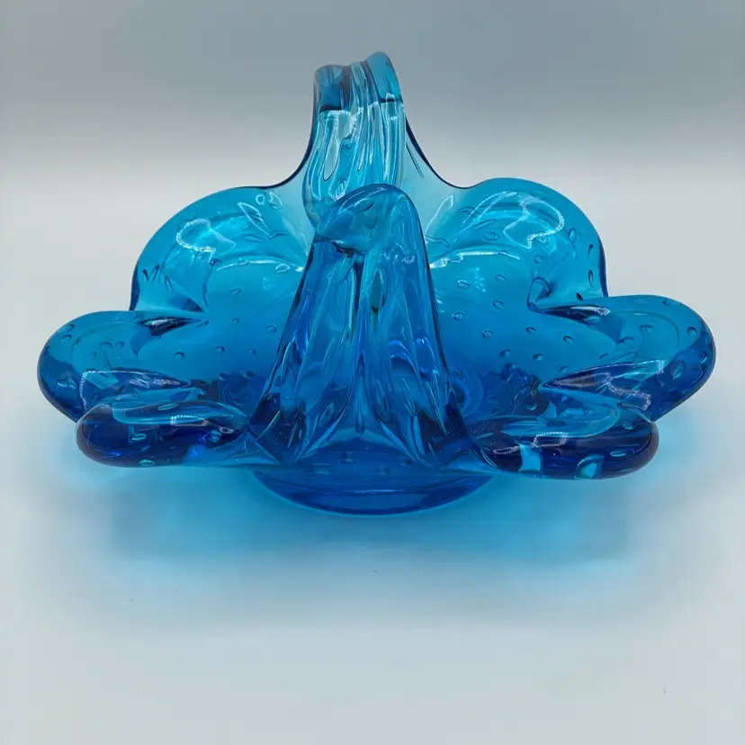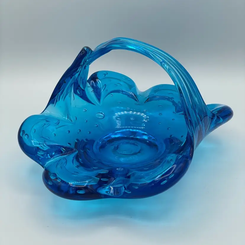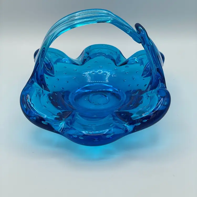 Vintage Blue Art Glass Basket With Bubbles. Solid/Heavy Piece. Lovely Decor Piece. No Chips/Cracks. 8 1/2" W X 5" H *