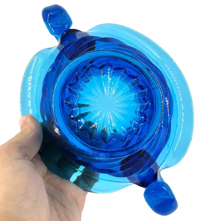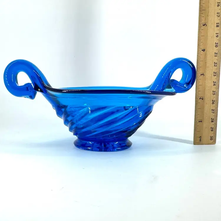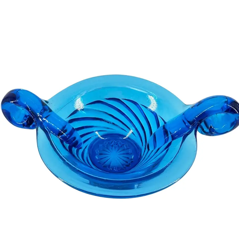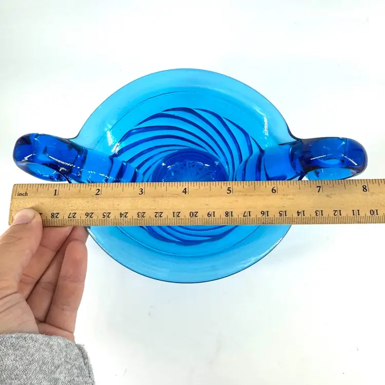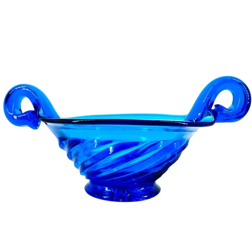 This blue Art glass bowl has small handles. There are NO chips or cracks, does have some little scratches all around can be seen in the pictures. Also does NOT have a markings or signatures.