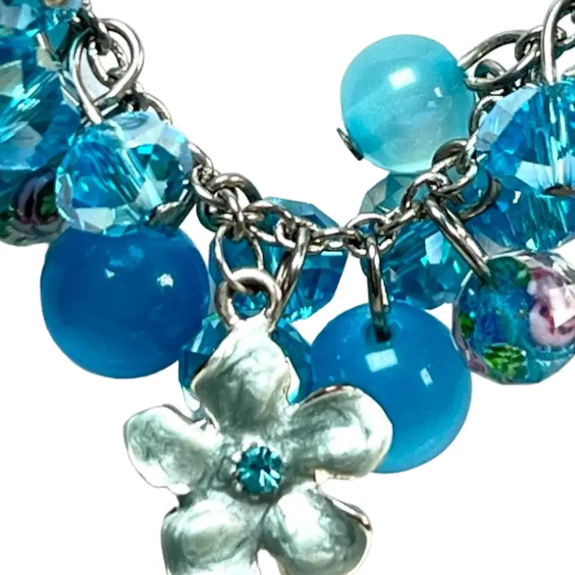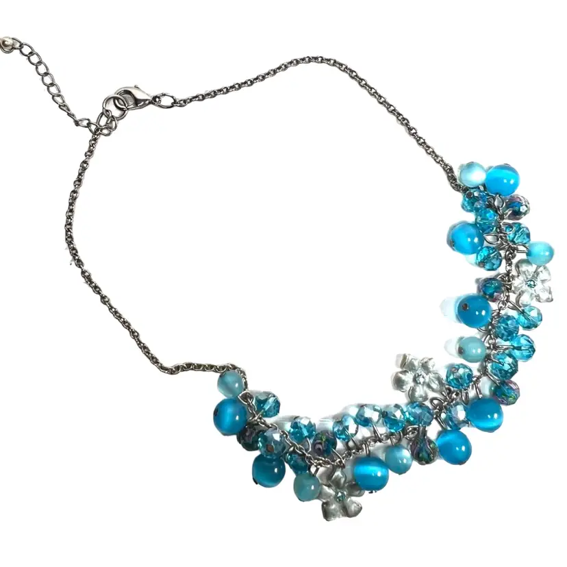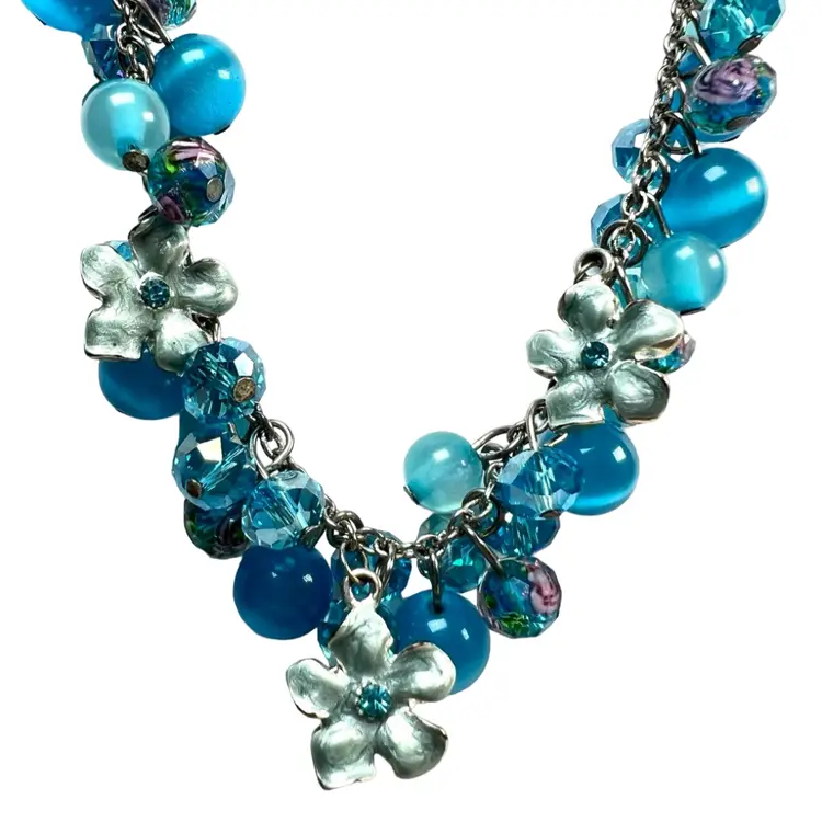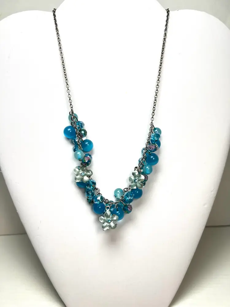 Sweet little blue beads and flowers. Beads are plastic. Silver-tone chain. Length drop ~8” to 9-1/4” due to extension. No maker’s mark. Great condition. No missing beads or rust.