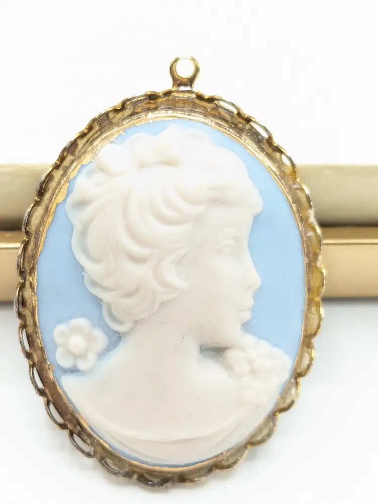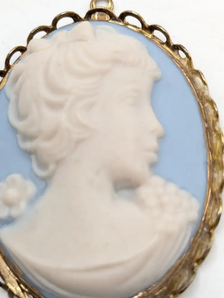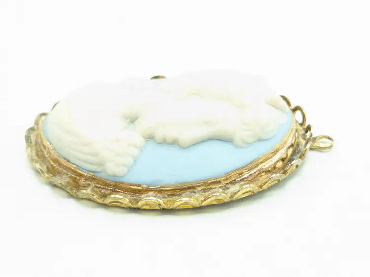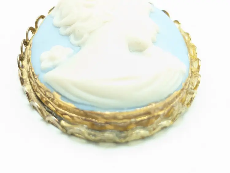 Good condition the back could use a cleaning. Gold tone frame. White bisque carved cameo on a blue bisque background. Measures 1 3/4" in length and 1 1/4" wide. EN2