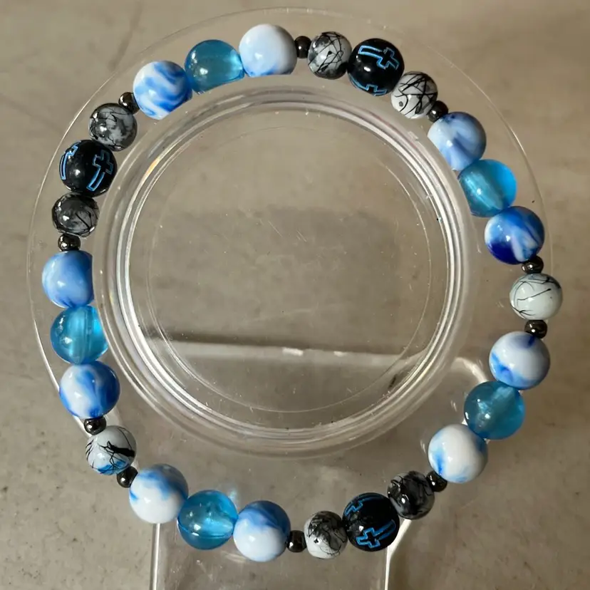 Handmade bracelet in tones of blue with crossed wrist size is 7.5-8.5 on stretchy cord