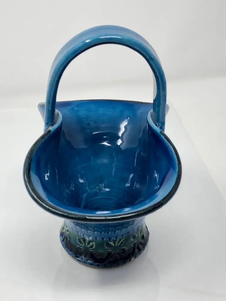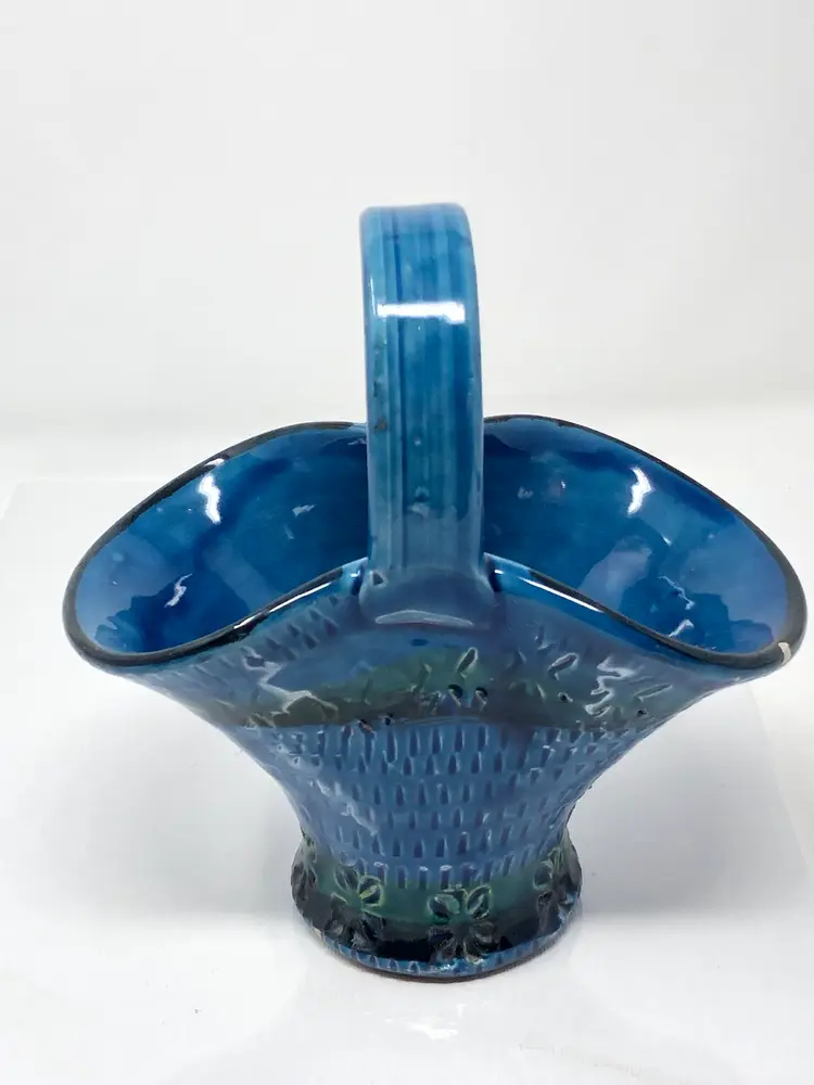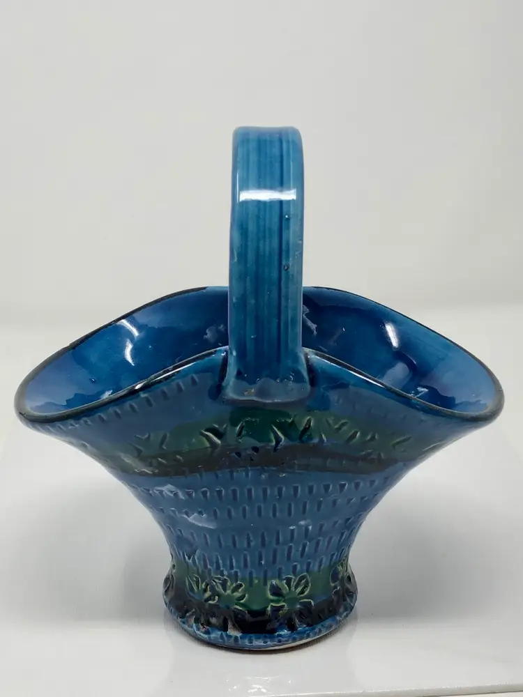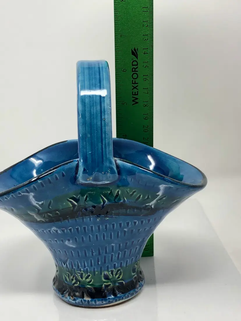 7" ceramic basket with beautiful blue and green glaze with etched design. Stamped Made in Italy on the base. Some small chipping as shown in photos.