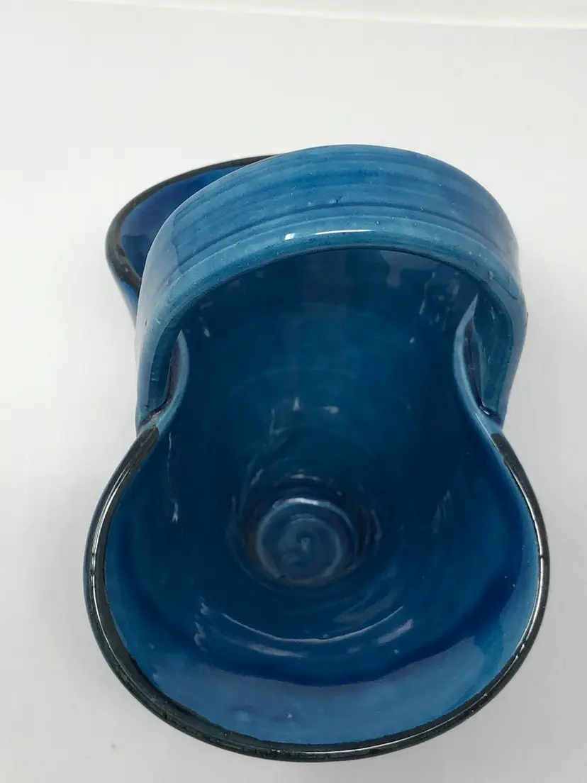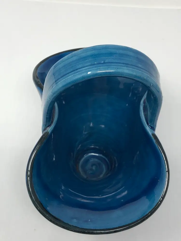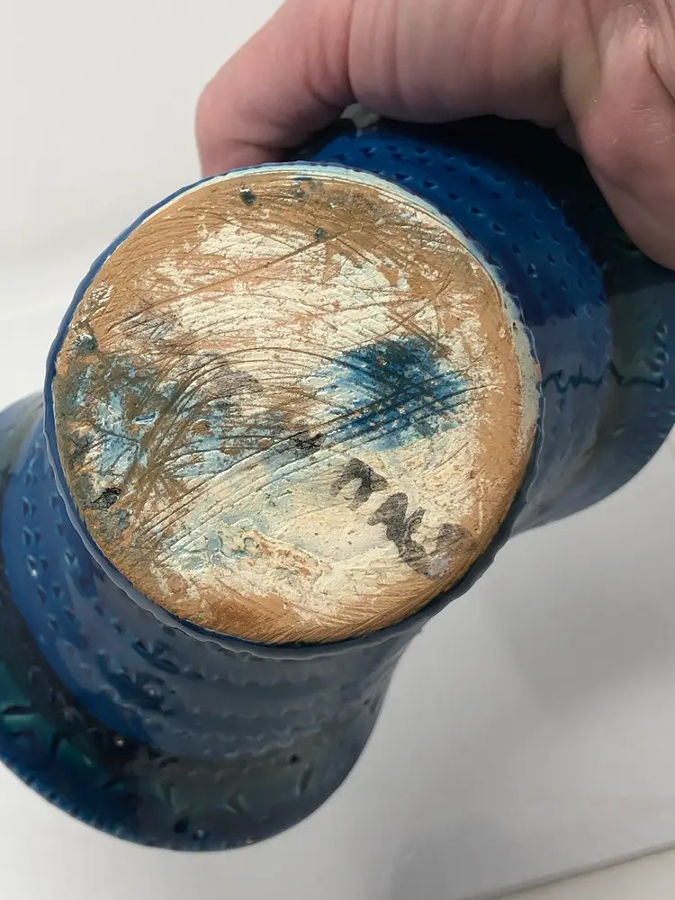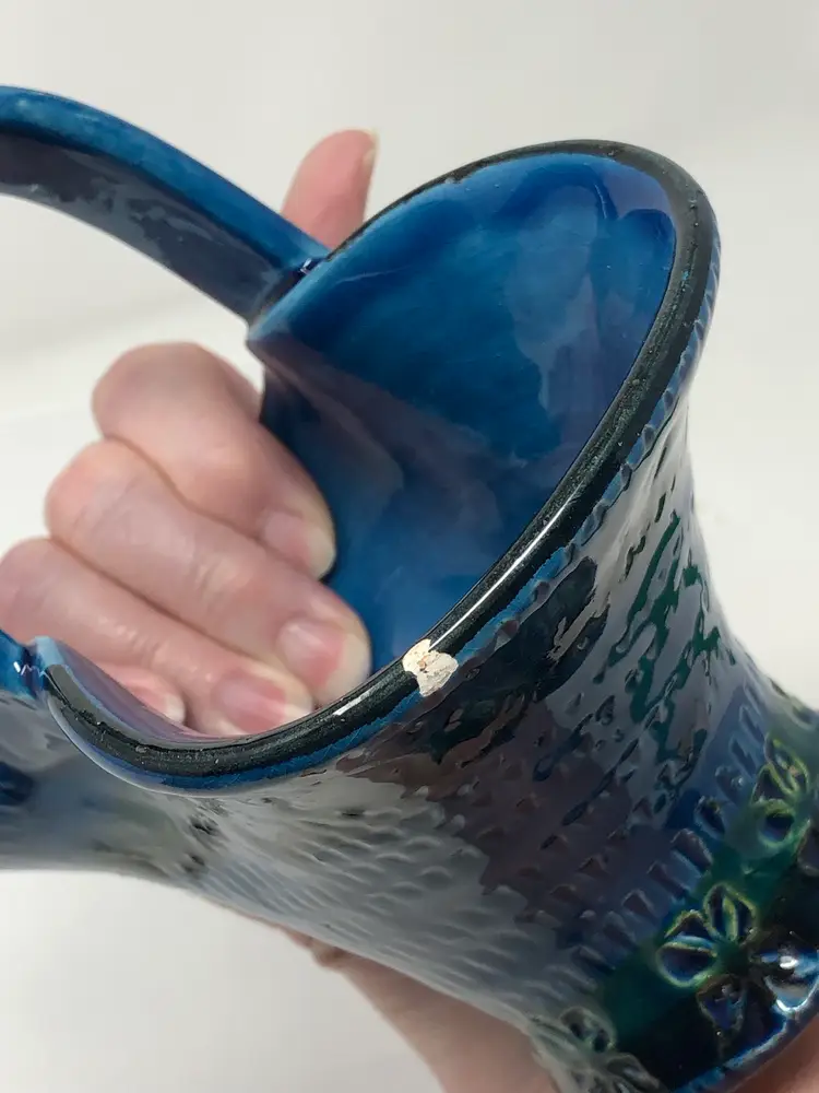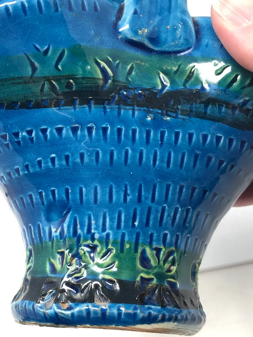 7" ceramic basket with beautiful blue and green glaze with etched design. Stamped Made in Italy on the base. Some small chipping as shown in photos.