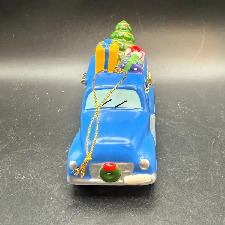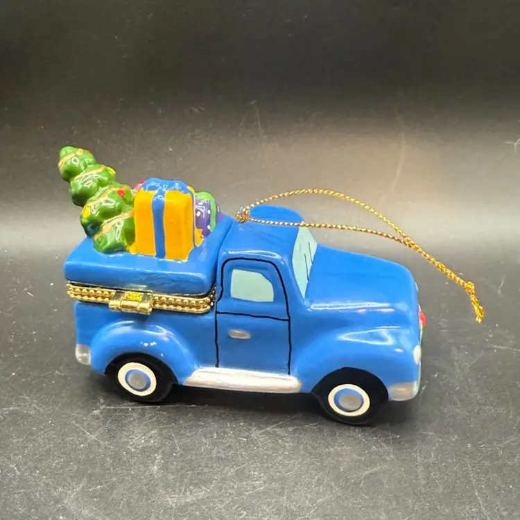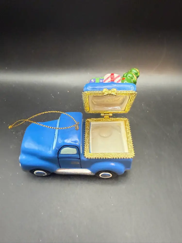 This cute ornament , a blue pickup truck filled with gifts and a Christmas tree, is also trinket box.