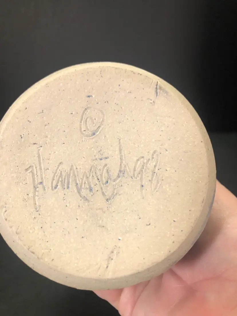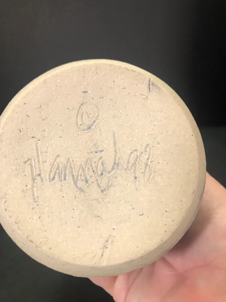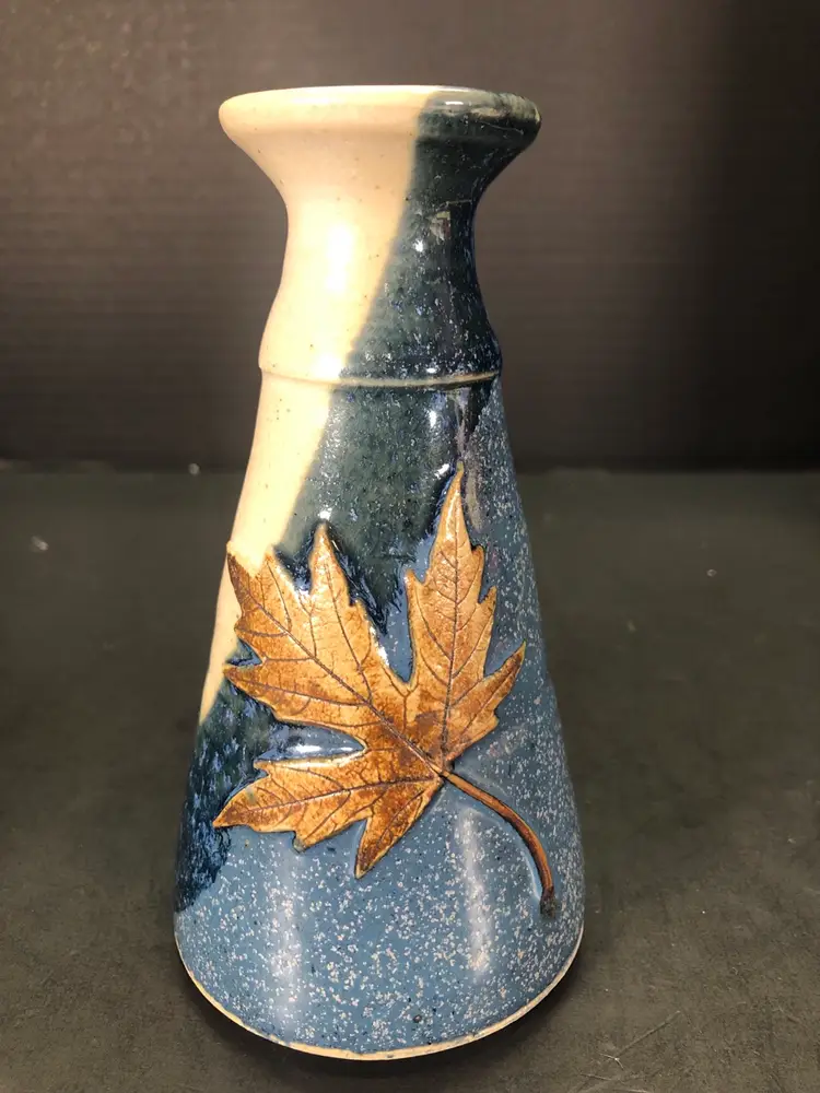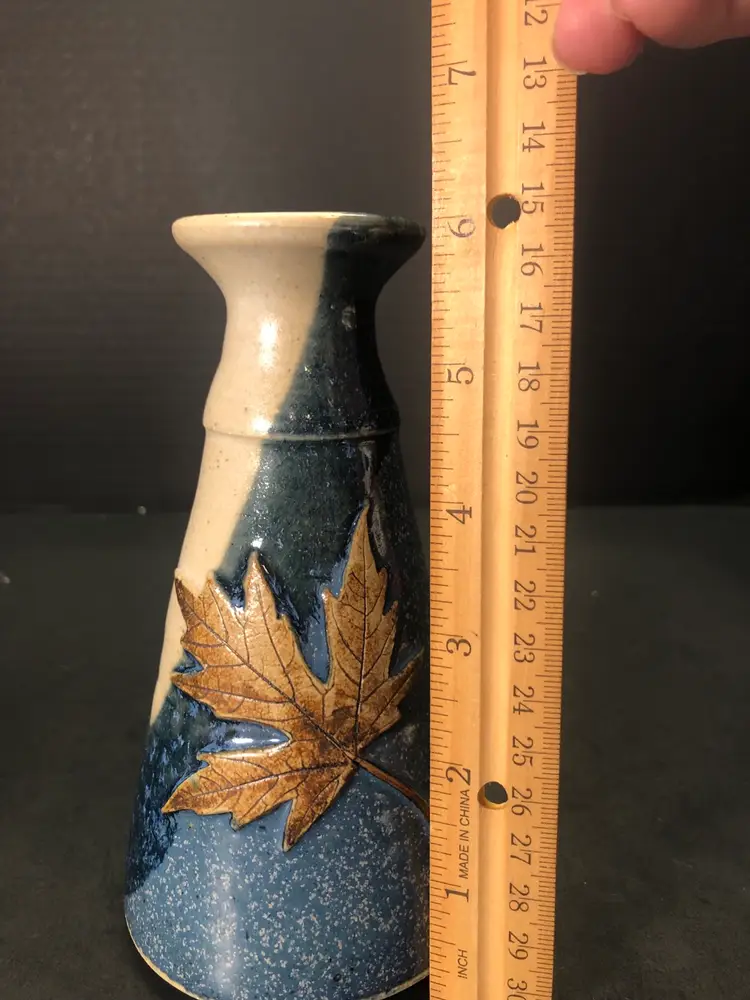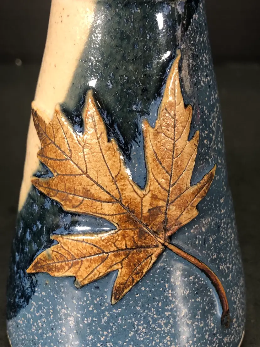 This vase is 6” tall and has a brown leaf imprint. It is signed Hannah 98.