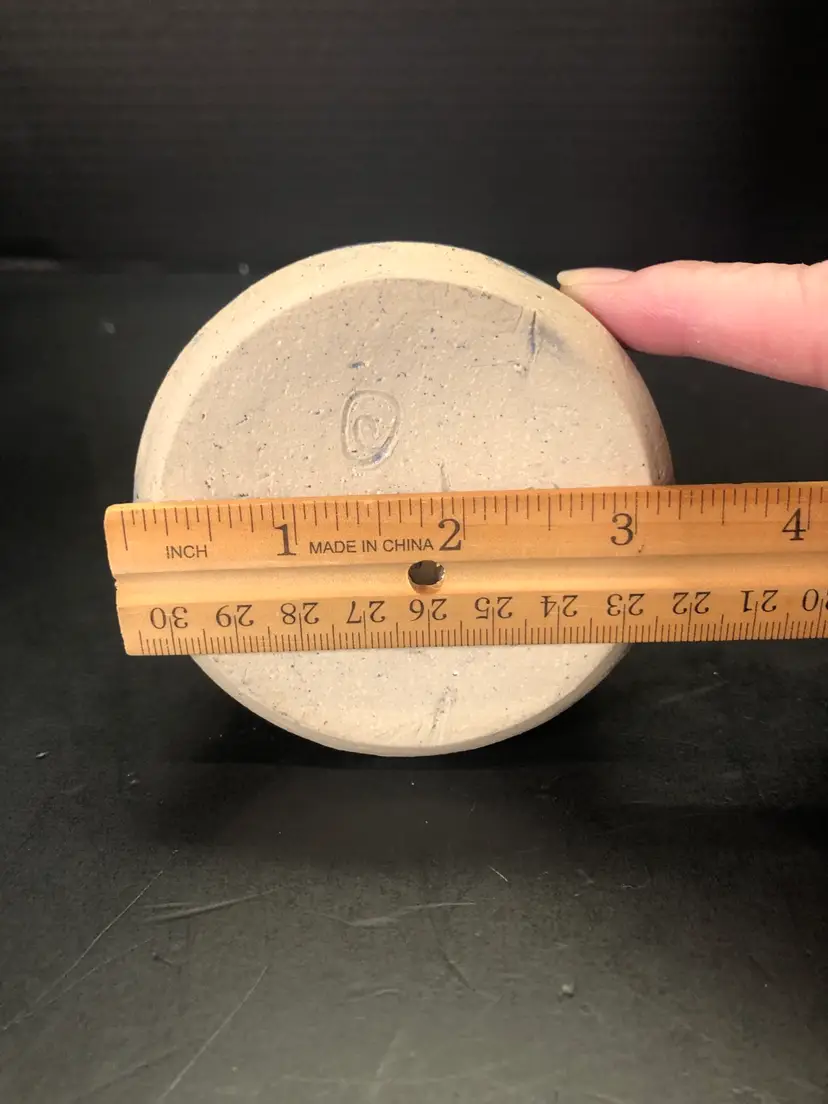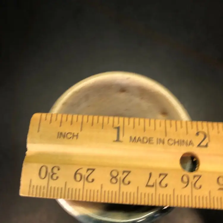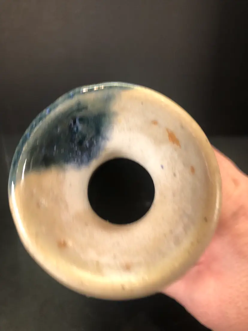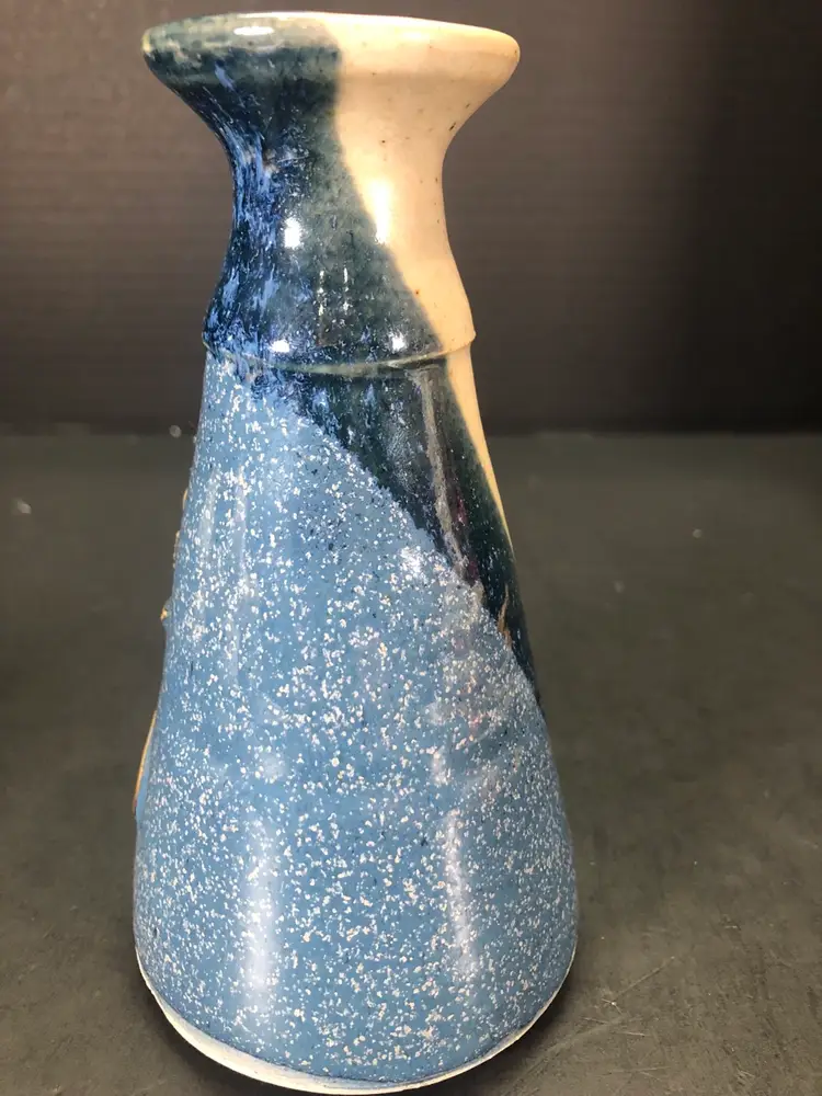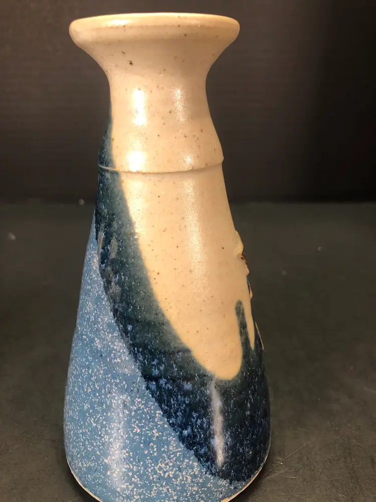 This vase is 6” tall and has a brown leaf imprint. It is signed Hannah 98.