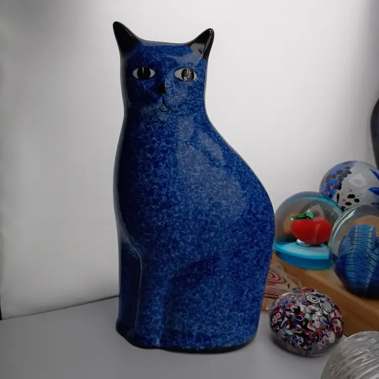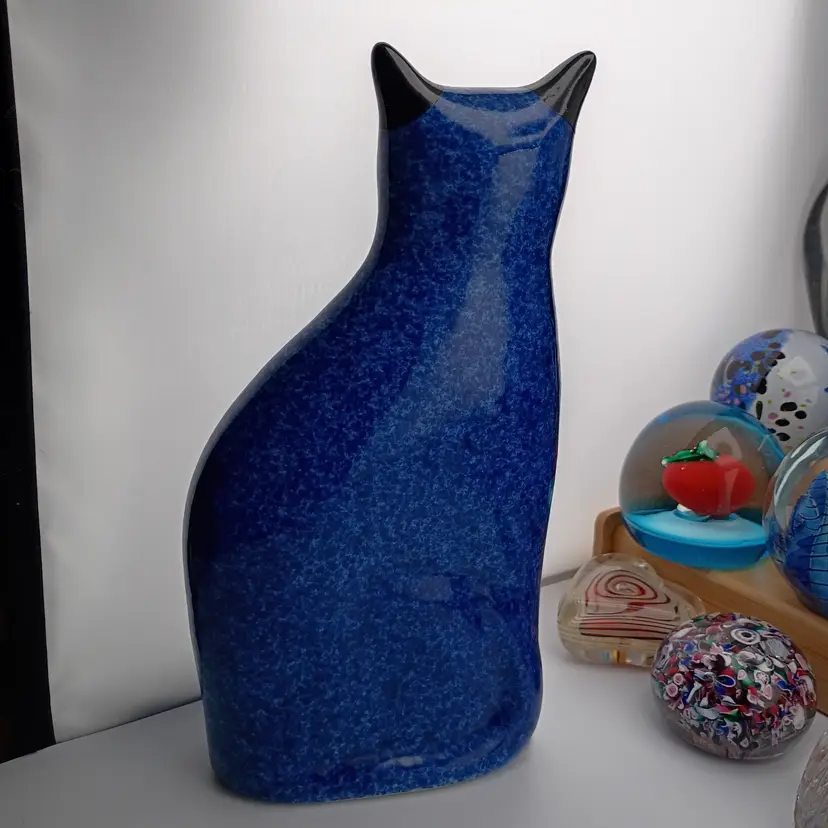 It's a lovely speckled blue ceramic cat with black ears and eyes. She's in excellent vintage condition with no chips or cracks. I touched up the black paint in one eye.