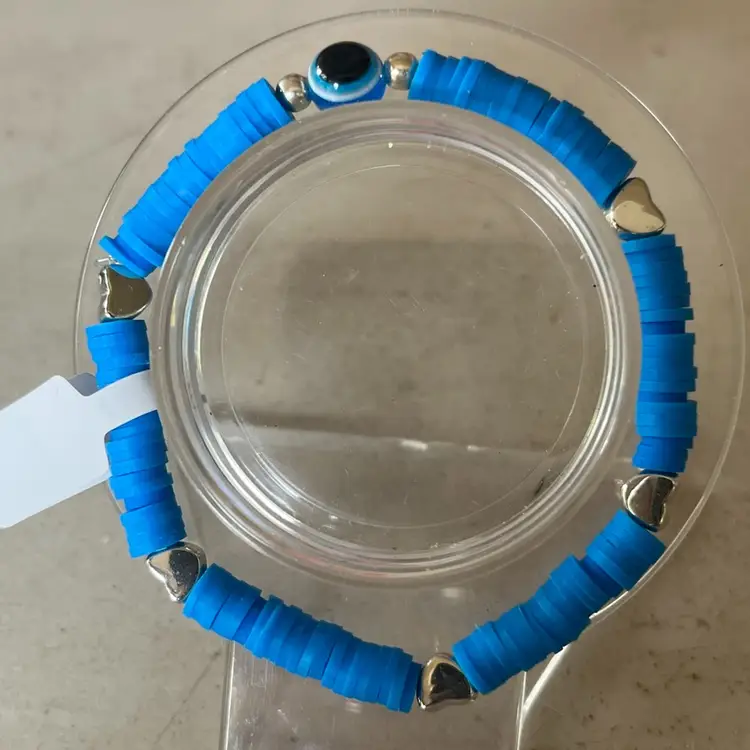 Handmade evil eye bracelet made with clay, silver hearts and acrylic beads 7 1/2 to 8 1/2 wrist size