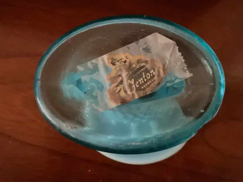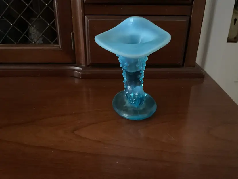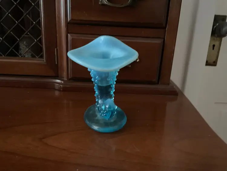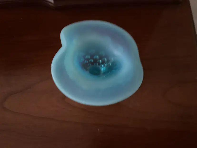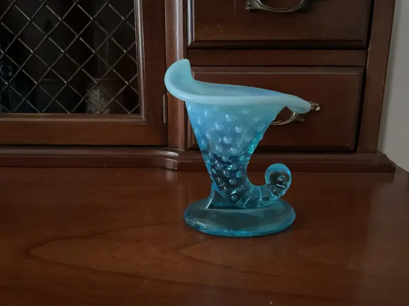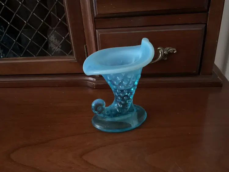 Vintage Fenton hobnail cornucopia/slipper vase. 3 1/2” tall Beautiful blue opalescent. Fenton label has been taped to the bottom. Great vintage condition.