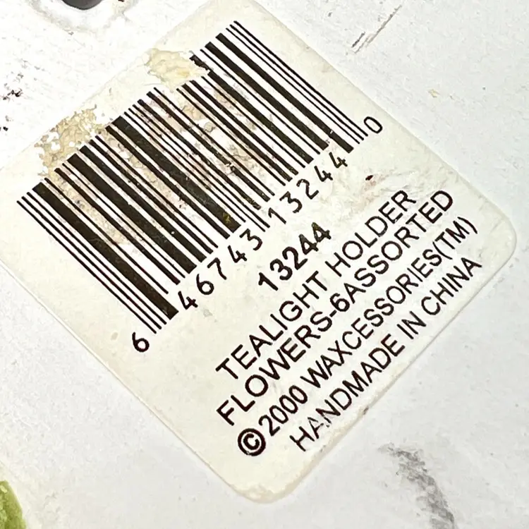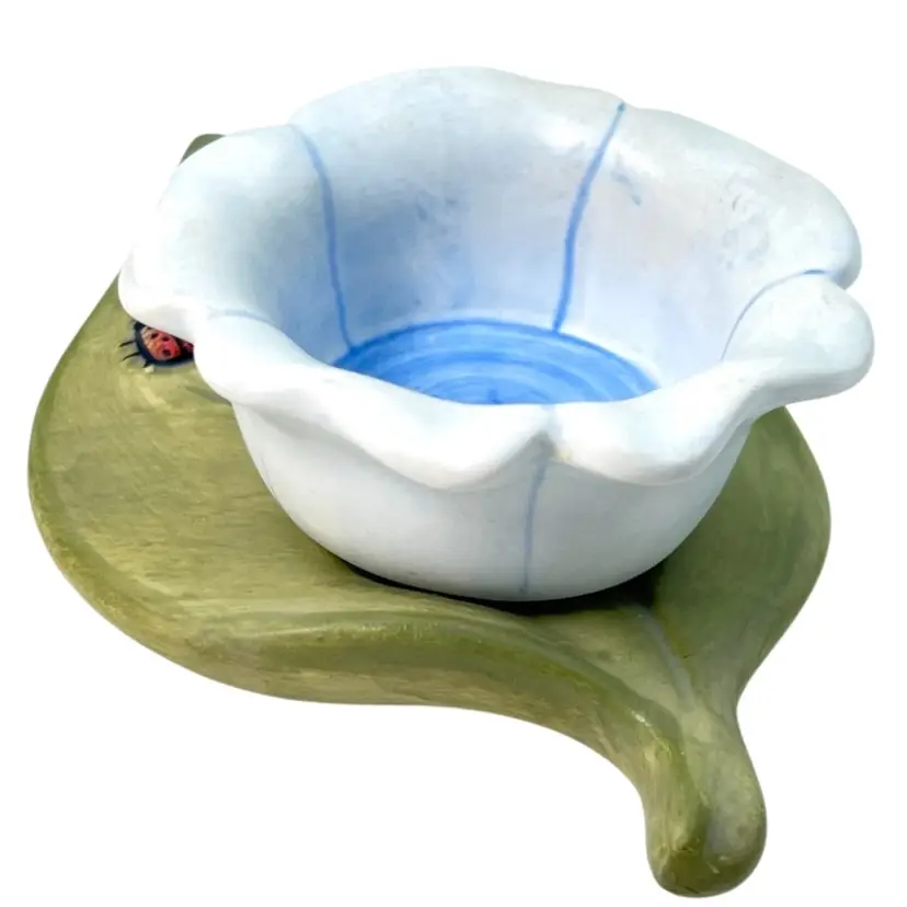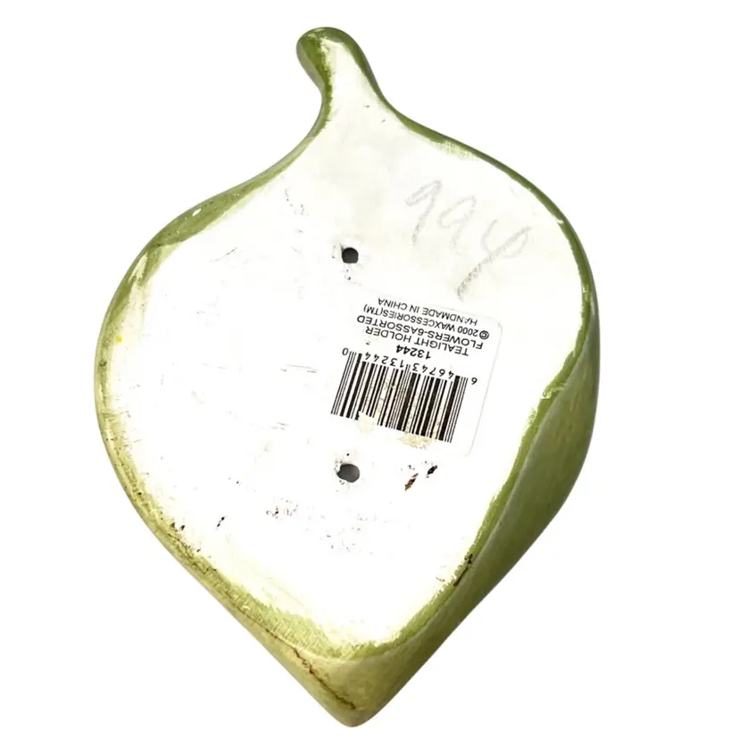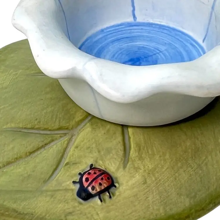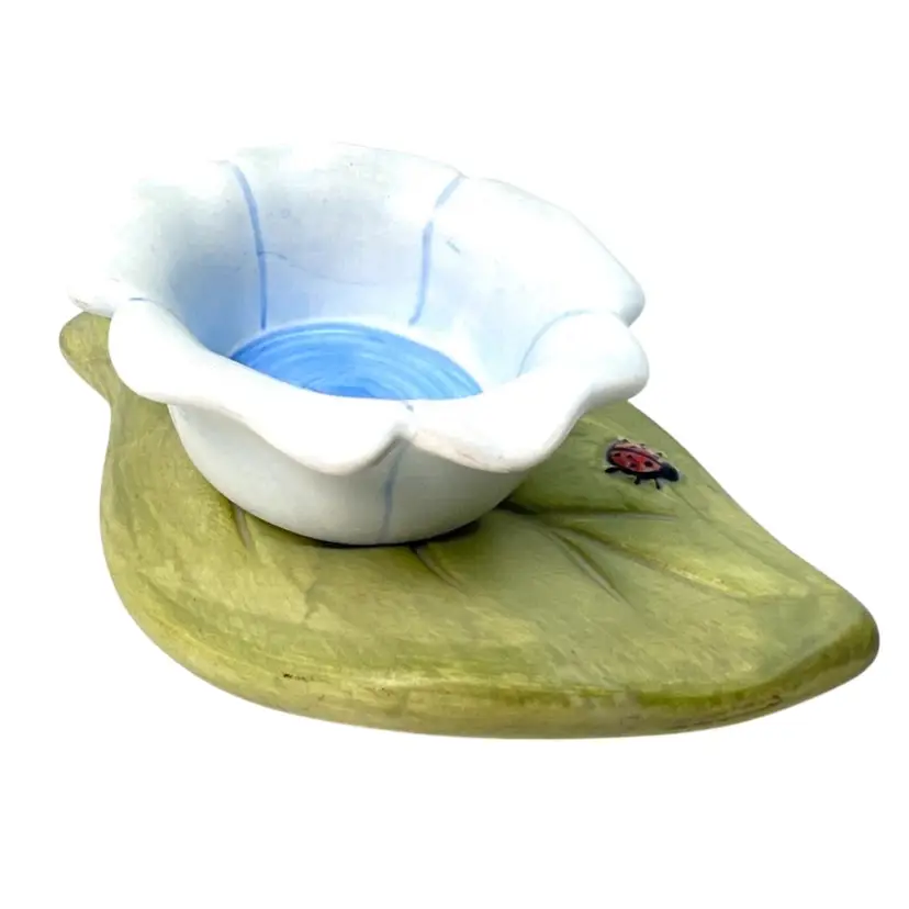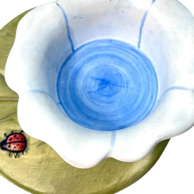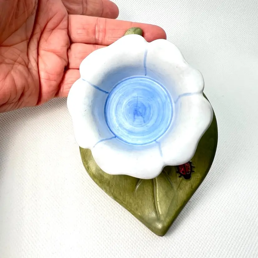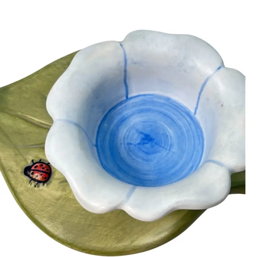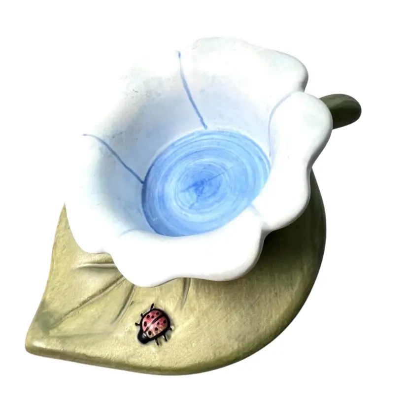 Blue Flower & Ladybug On Green Leaf Tea light Votive Holder. Original price sticker on bottom. Vintage 2000. Handmade in China. 5” length x 4-1/4” wide x 1-1/2” tall. Condition: Pretty colors No chips, no cracks, no repairs There is an old faded handwritten marker “99Y” on bottom- tried to remove but didn’t want to damage the finish of piece