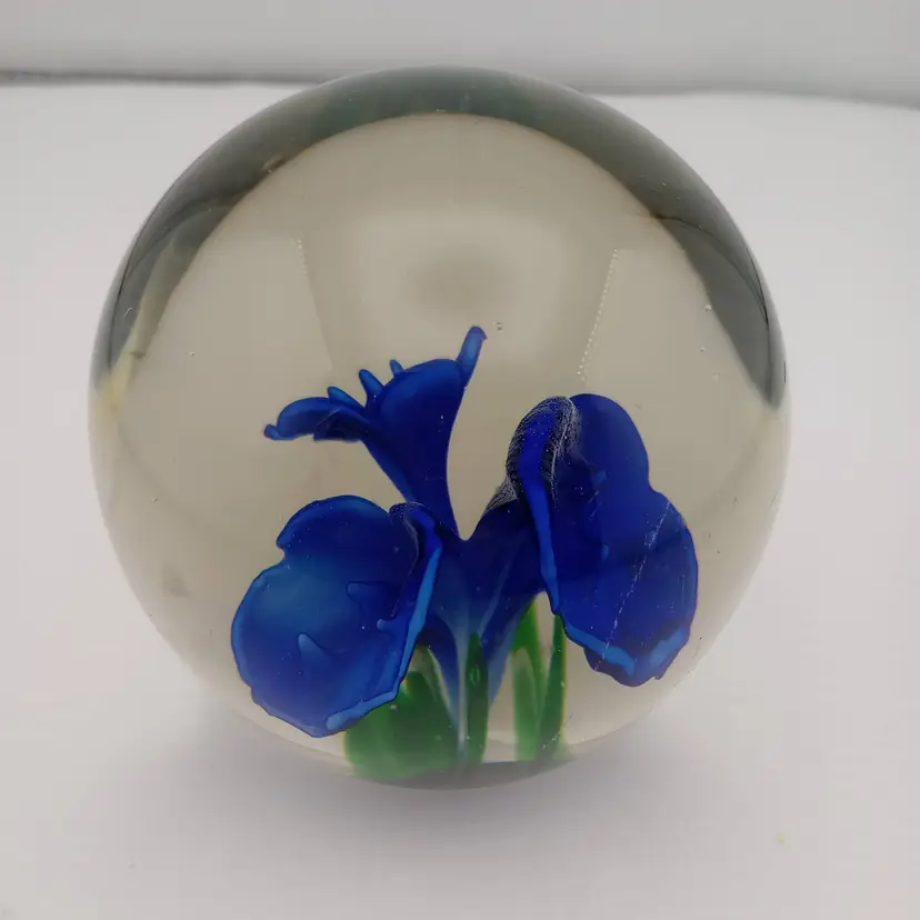 This is a large and beautiful paperweight with cobalt blue flowers. It's almost 4" tall and just under 3.5" wide. It is in very good condition with no bruises and a couple of small scuff marks.