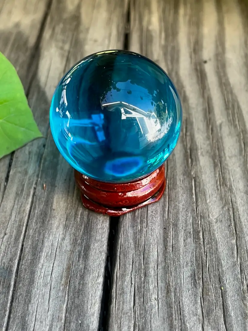 A blue glass orb. 30 mm. Approximately 1 1/2 inch. New old stock. A beautiful shade of blue. Wood stand is included.