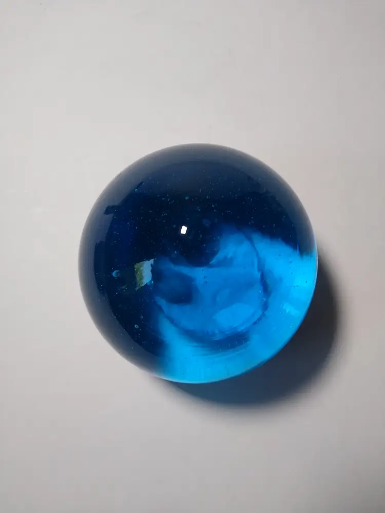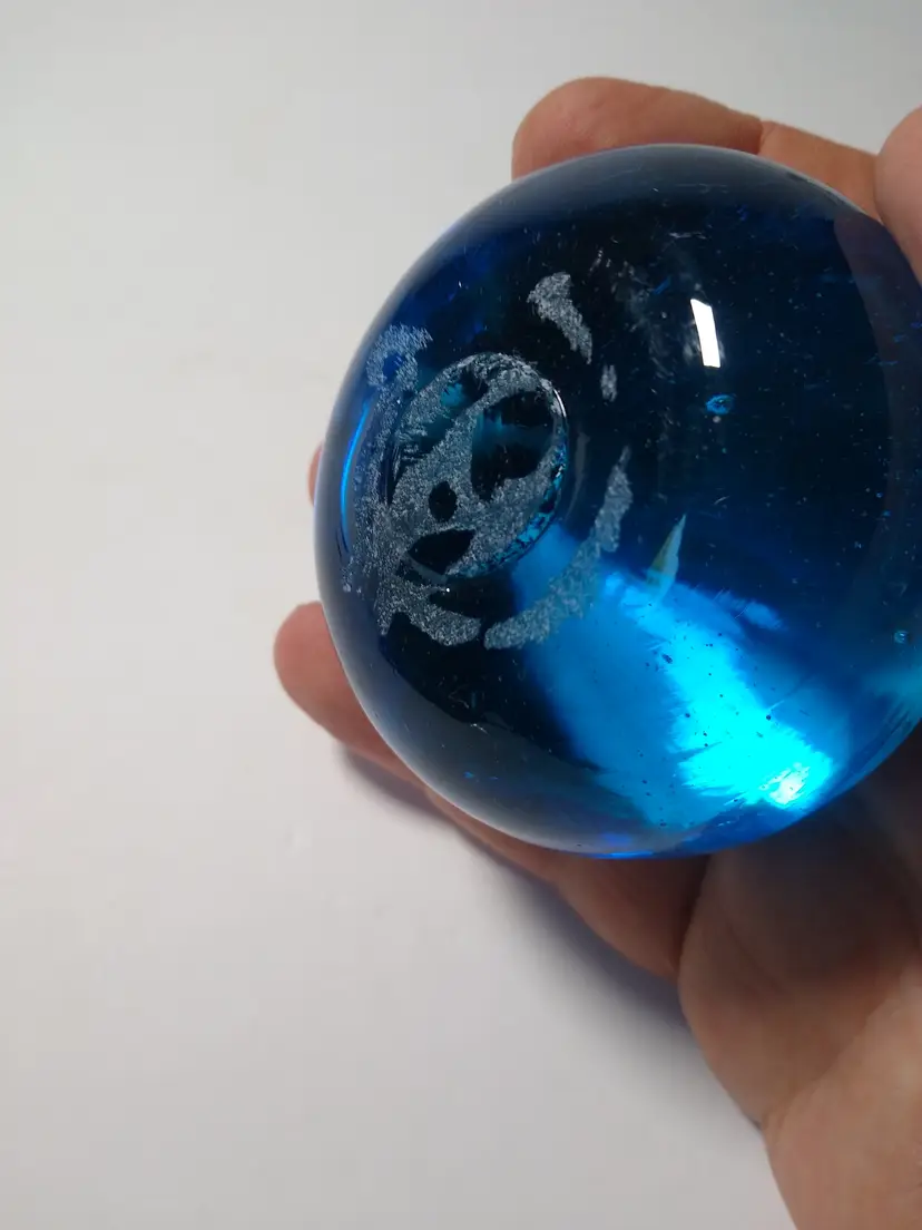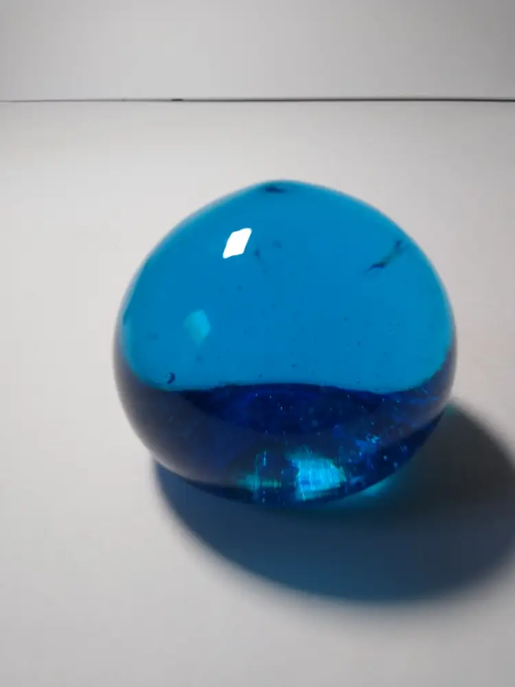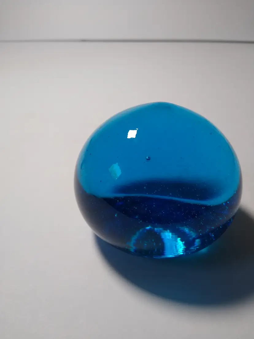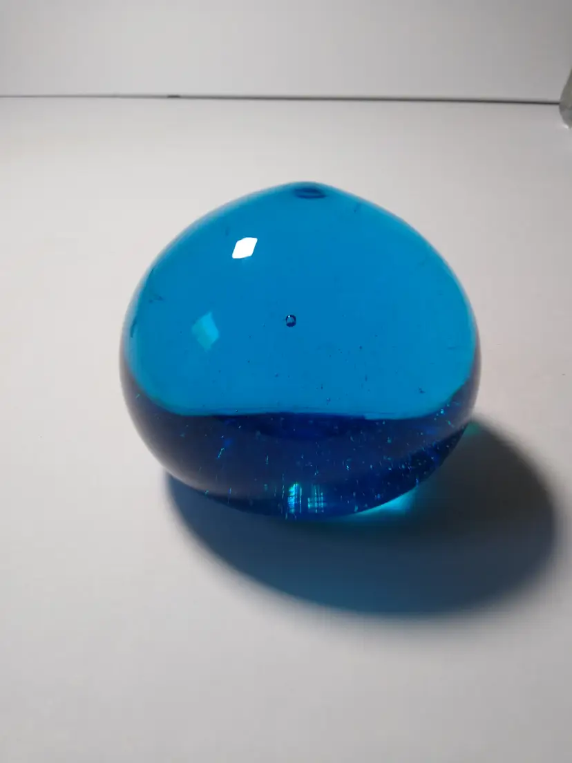 This Blue Glass Paperweight measures approx 2 inches tall. It is unsigned/unmarked and has a couple of tiny blemishes in the surface.