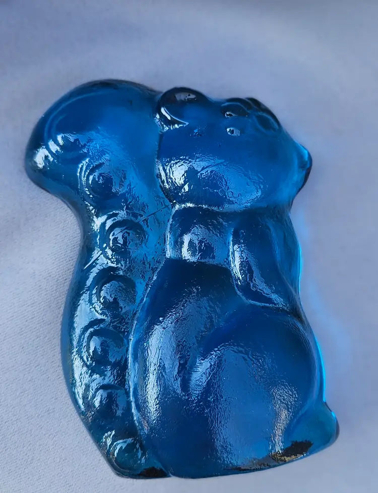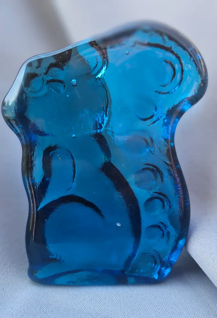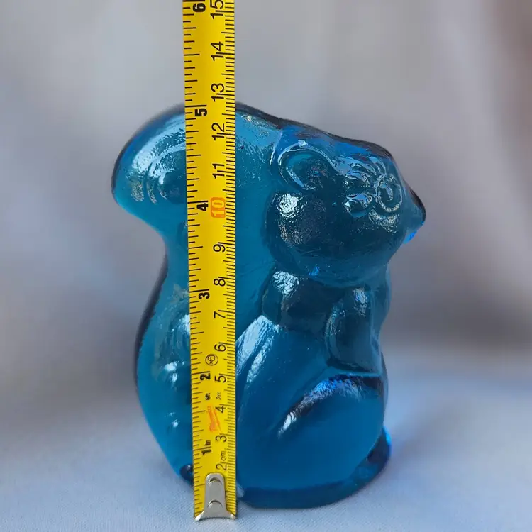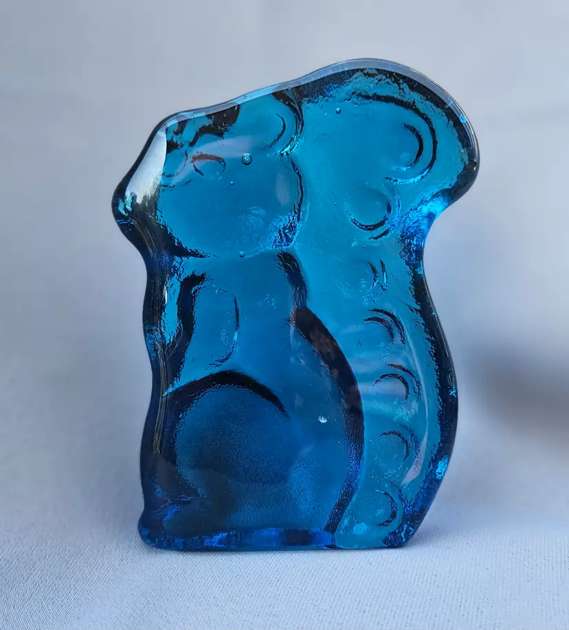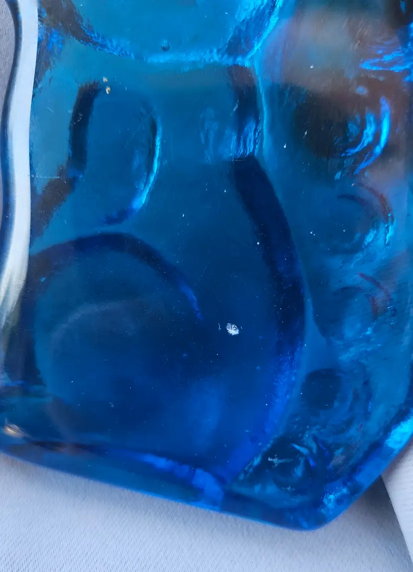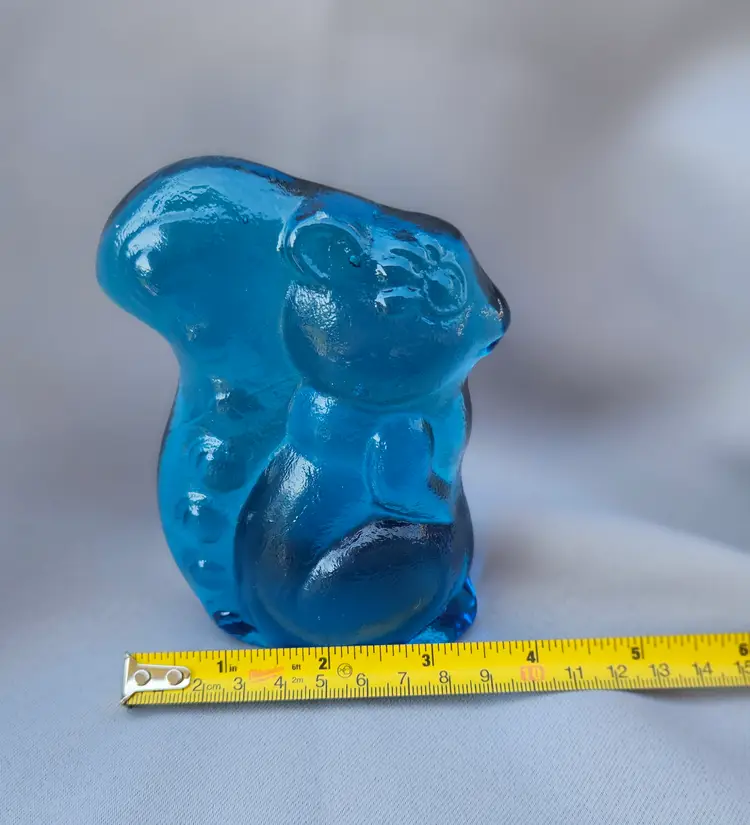 There is no makers mark or sticker; however, based on some online research, I believe the makers to be Viking Glass. The bottom is flat and smooth; as well as the backside. This piece can be displayed standing of lying down flat. It stands approximately 5" tall and is approximately 3 1/2" wide. It weighs a little over 2 pounds. It is in Good, Pre-owned condition, showing minimal wear from age and previous use. There are no breaks, no cracks. There is small, minor knick seen at the under/backside but it's not seen from the front. See all photos of description