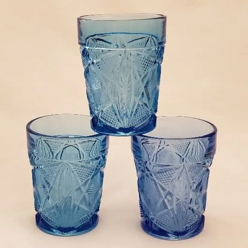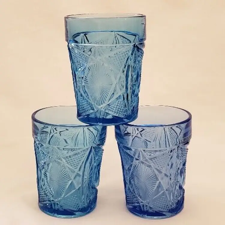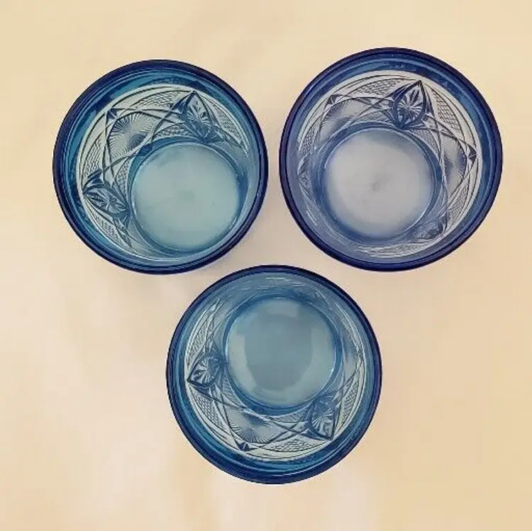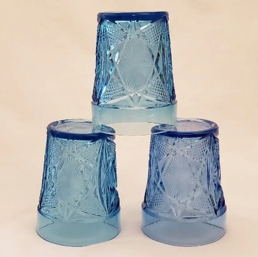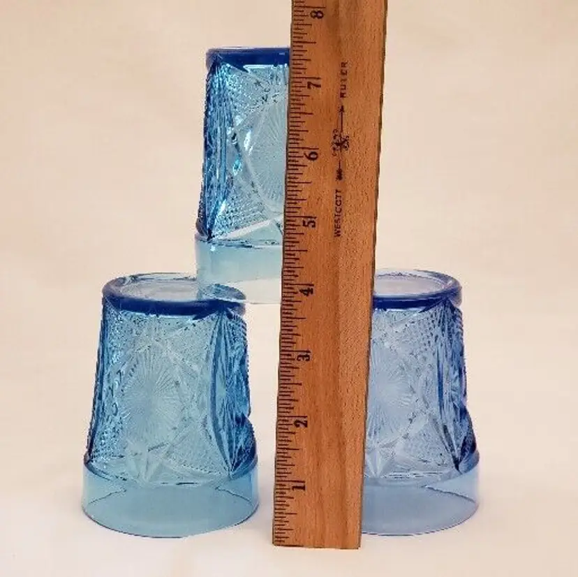 Brand: Unmarked Main Color: Blue Pattern: Cut Star Pattern Type: Tumbler Glass Color: Blue Original/Reproduction: Antique Original Style: Decorative Material: Glass Features: Cut Star Pattern Vintage: Yes Vintage Blue Glass Tumbler Old Barware Decorative Collectible Set Of 3 - Cut Star Pattern. 3 3/4" tall approximately. Used condition with some dirt in the recesses of the cuts, few tiny fleabites, otherwise looks good. Please view all the photos and read the entire item description and if you have any questions please ask prior to purchase when possible.
