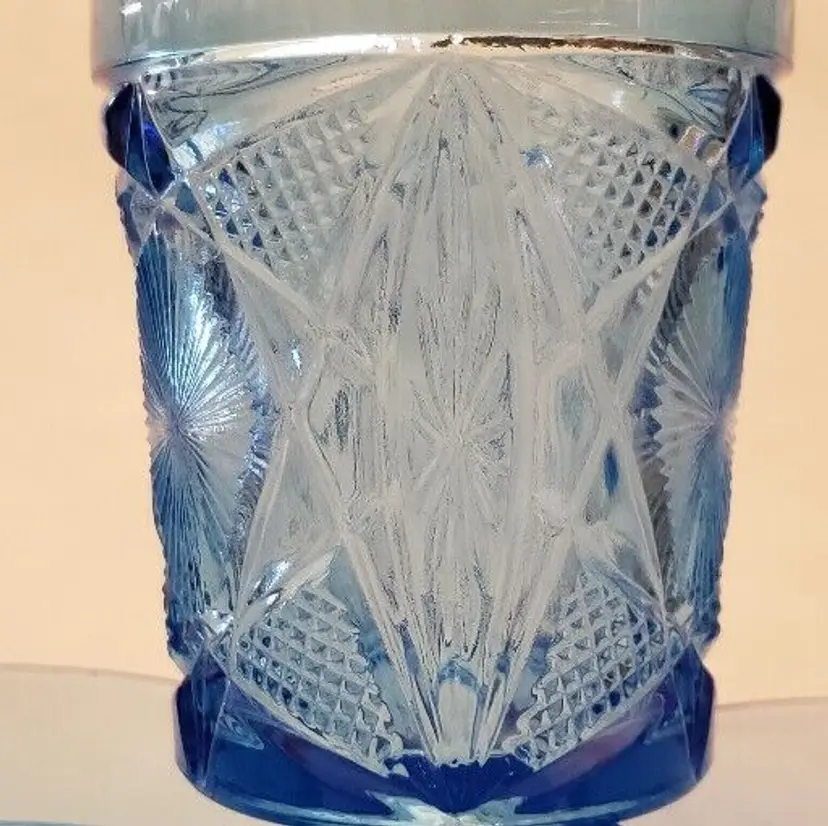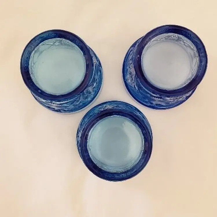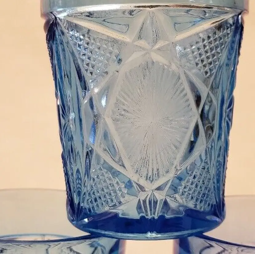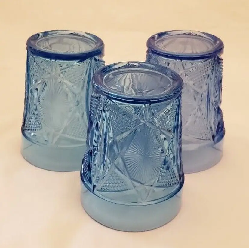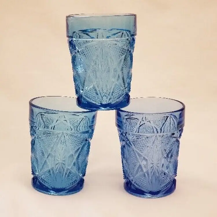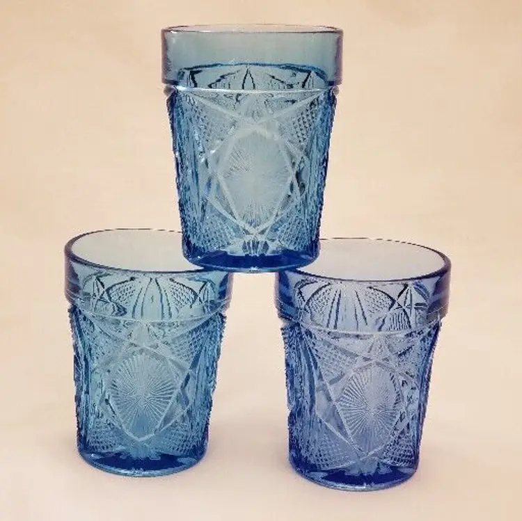 Brand: Unmarked Main Color: Blue Pattern: Cut Star Pattern Type: Tumbler Glass Color: Blue Original/Reproduction: Antique Original Style: Decorative Material: Glass Features: Cut Star Pattern Vintage: Yes Vintage Blue Glass Tumbler Old Barware Decorative Collectible Set Of 3 - Cut Star Pattern. 3 3/4" tall approximately. Used condition with some dirt in the recesses of the cuts, few tiny fleabites, otherwise looks good. Please view all the photos and read the entire item description and if you have any questions please ask prior to purchase when possible.