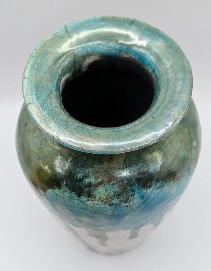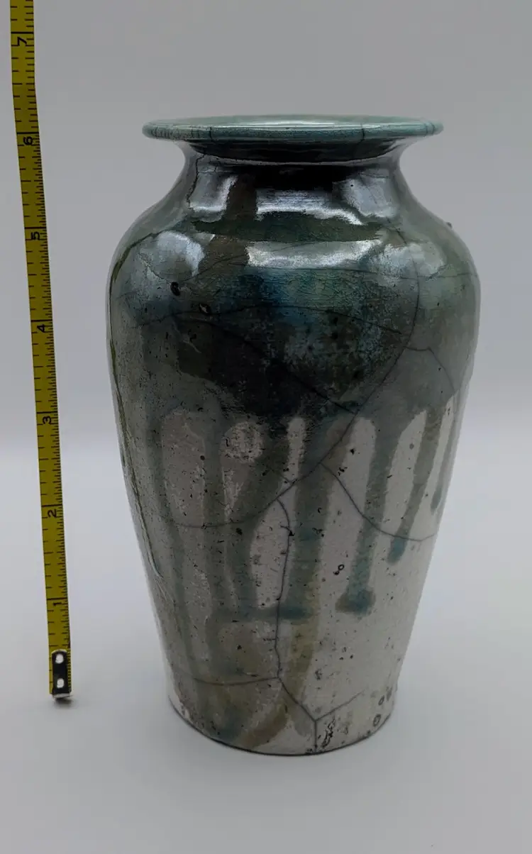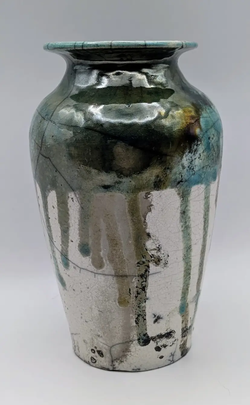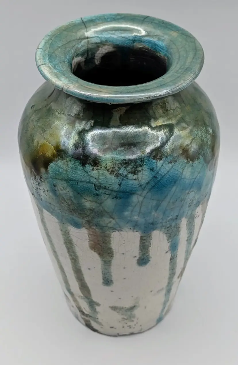 Beautiful raku pottery case with a blue and green drip glaze on a white base. I believe it is signed "Kennesaw ... University, Spring Festival." It is approximately 6 inches tall and 4 inches wide. EUC